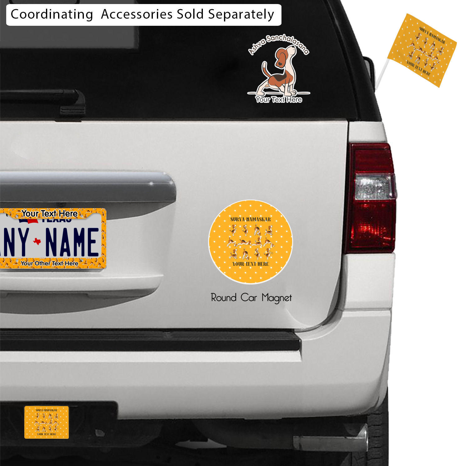 This design has a bright and happy background with little suns that are light yellow, while the rest is a slightly darker bright yellow. The main piece of the design is the set of adorable dogs doing yoga in several different positions. Your personalization goes above and below these graphics.