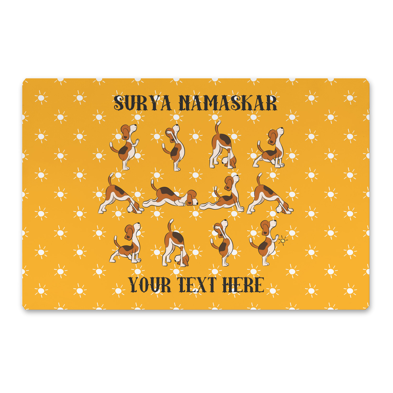 This design has a bright and happy background with little suns that are light yellow, while the rest is a slightly darker bright yellow. The main piece of the design is the set of adorable dogs doing yoga in several different positions. Your personalization goes above and below these graphics.