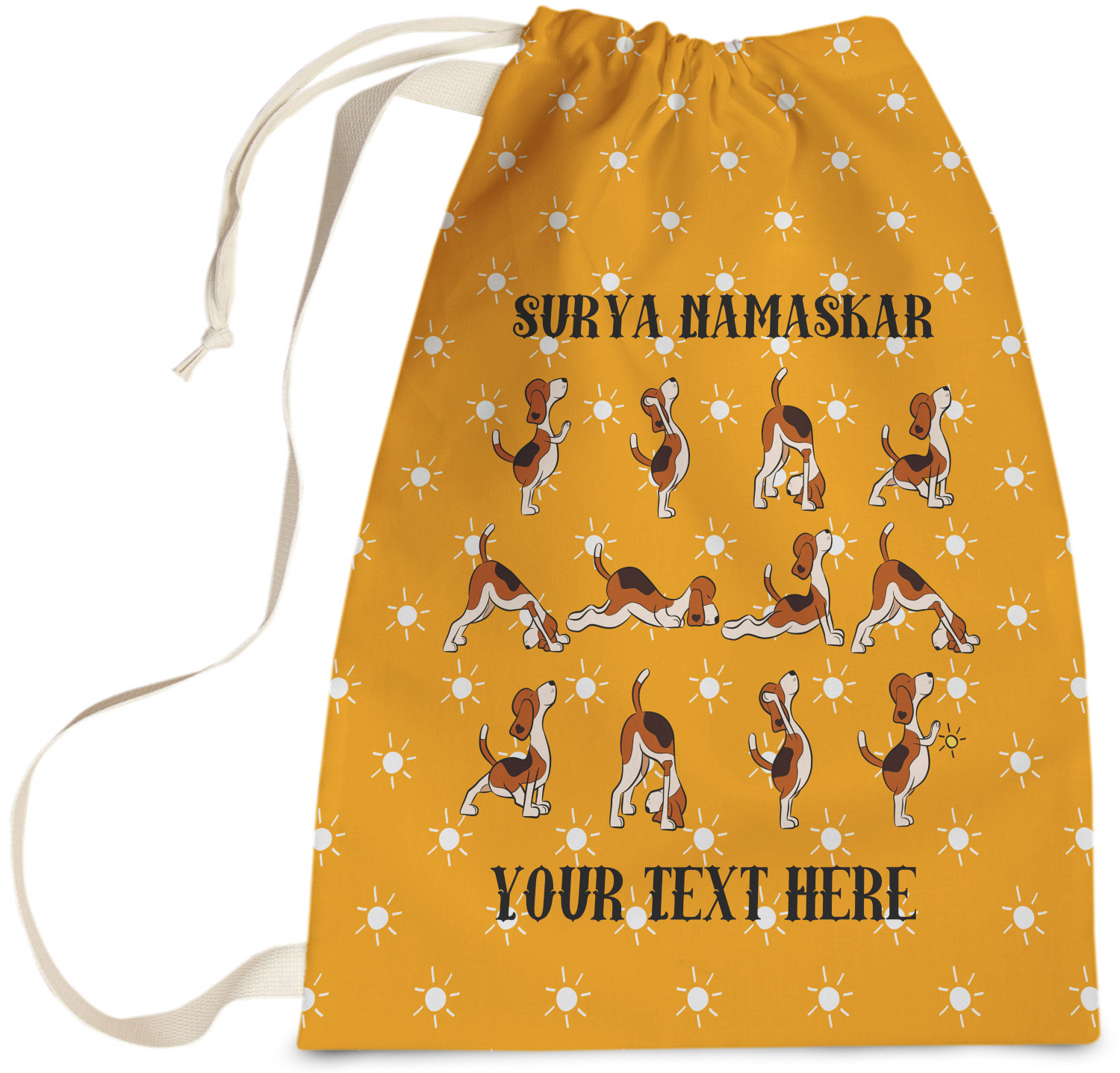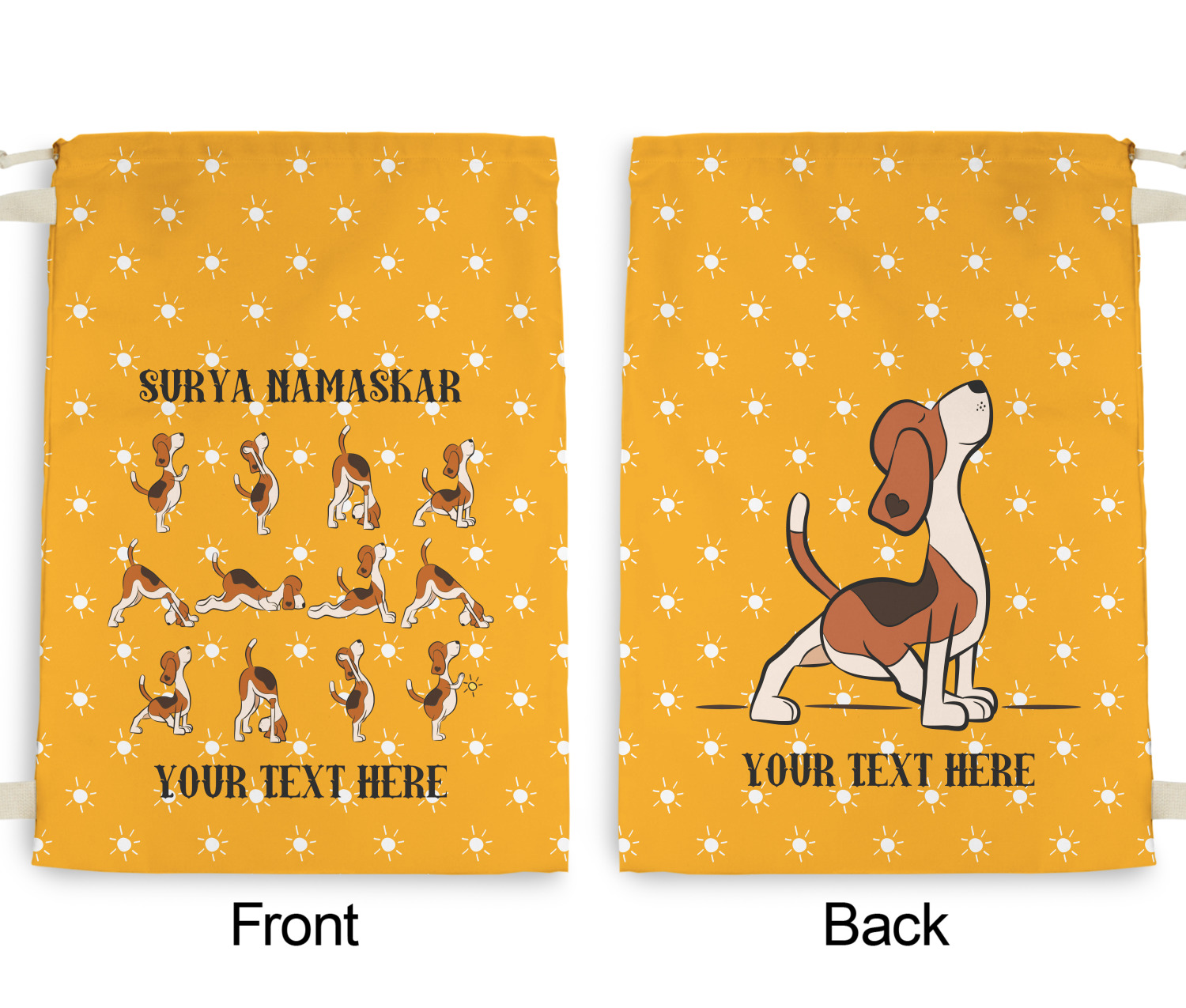 This design has a bright and happy background with little suns that are light yellow, while the rest is a slightly darker bright yellow. The main piece of the design is the set of adorable dogs doing yoga in several different positions. Your personalization goes above and below these graphics.