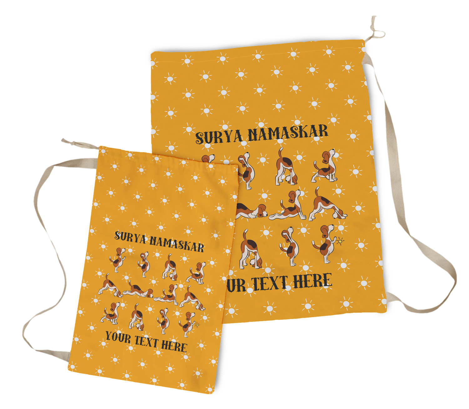This design has a bright and happy background with little suns that are light yellow, while the rest is a slightly darker bright yellow. The main piece of the design is the set of adorable dogs doing yoga in several different positions. Your personalization goes above and below these graphics.
