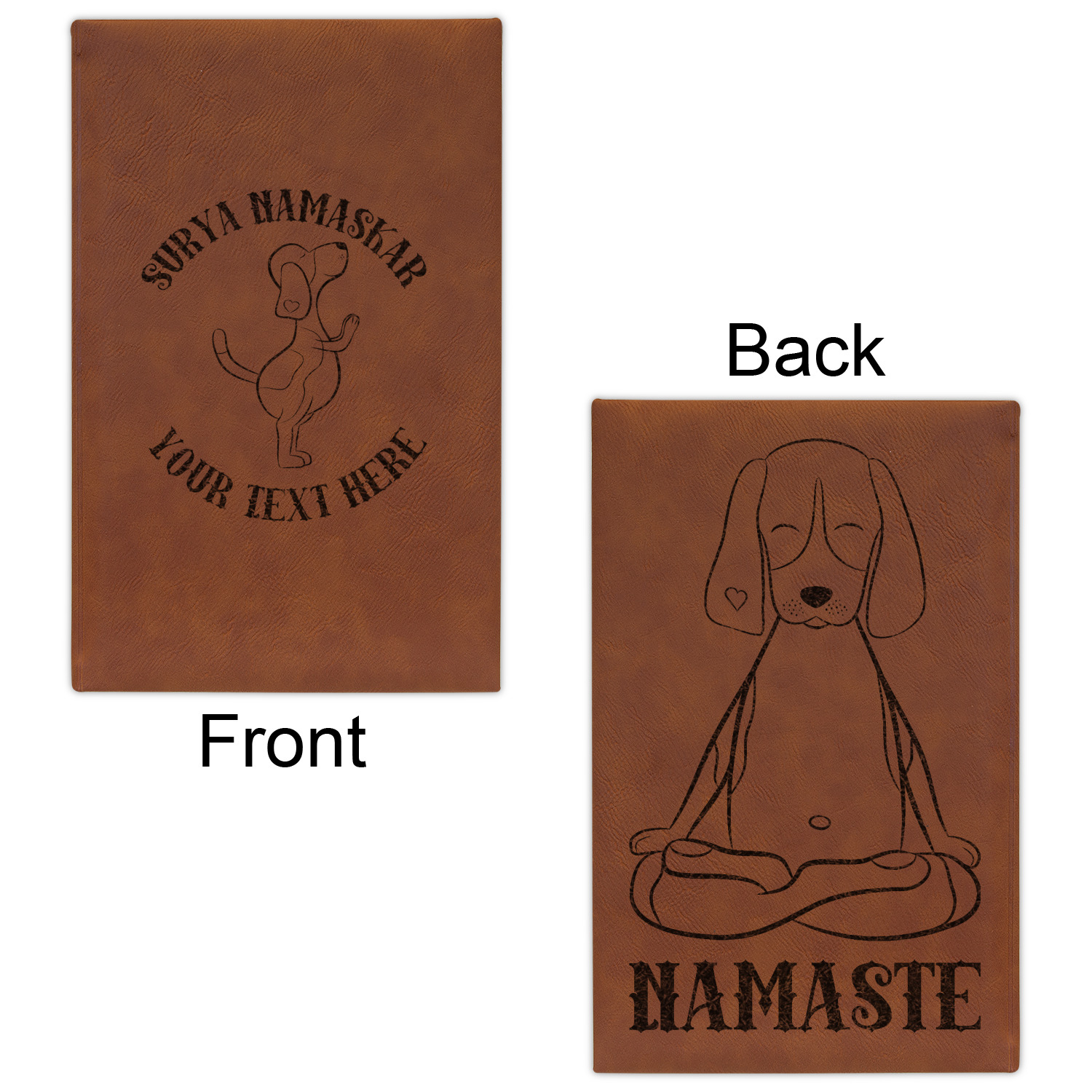 The faux leather covers are a rich cognac / rawhide color and can be customized with your design. From a simple name or monogram or a logo to a detailed mandala - the choice for customization & personalization is truly yours. Customize one of our designs or upload your own.