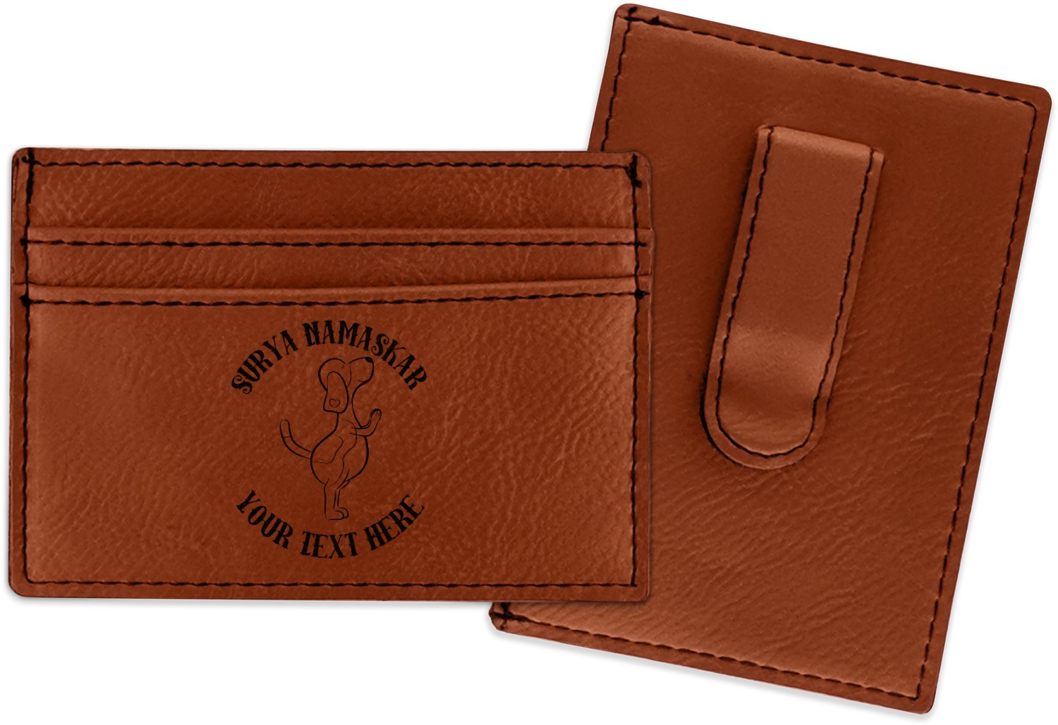 Made from a smooth brown leatherette material, these money clip wallets are the perfect accessory. They measure at approximately 4" x 2.75". On one side there is a money clip where you can slip in your cash. On the other side are three card slots for an ID and credit card or two. The money clip wallet will be laser engraved with your design on the side with the credit card slots. The graphic will come out as a black color.