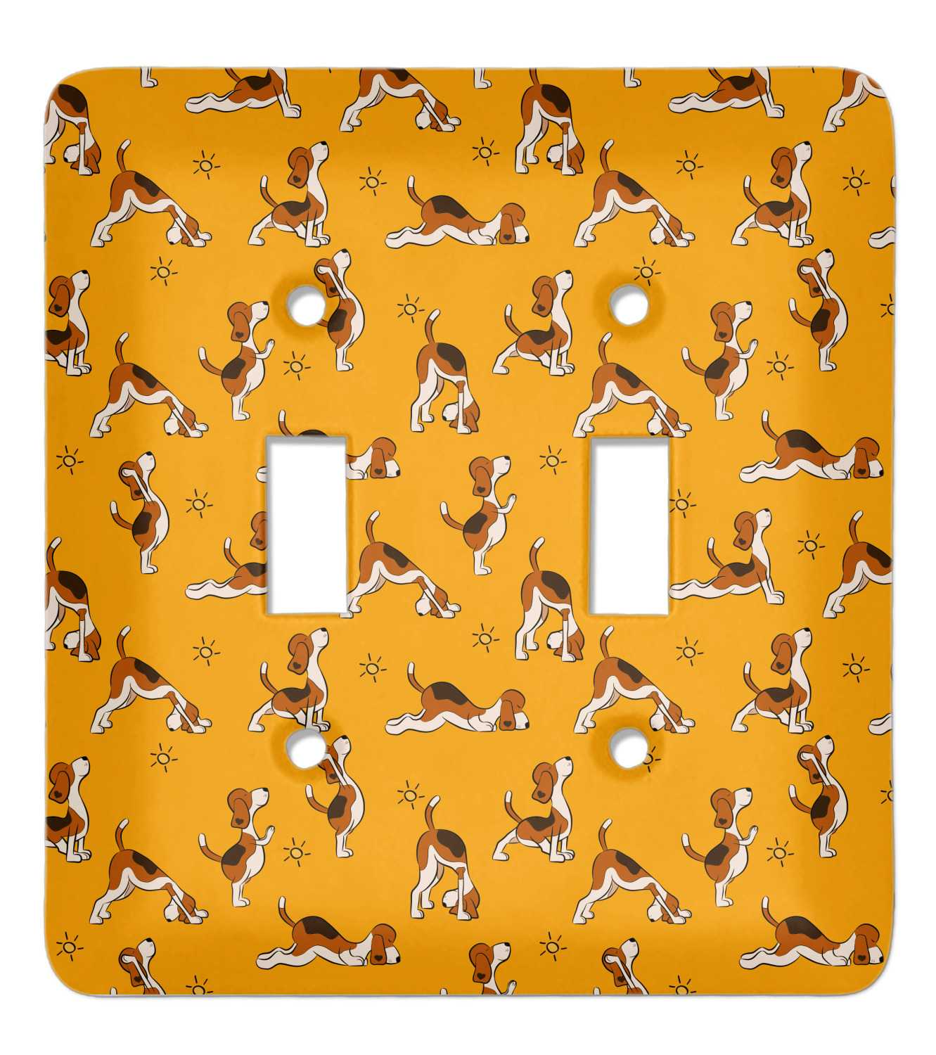 This design has a bright and happy background with little suns that are light yellow, while the rest is a slightly darker bright yellow. The main piece of the design is the set of adorable dogs doing yoga in several different positions. Your personalization goes above and below these graphics.