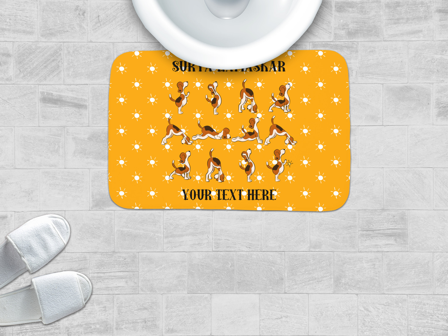 This design has a bright and happy background with little suns that are light yellow, while the rest is a slightly darker bright yellow. The main piece of the design is the set of adorable dogs doing yoga in several different positions. Your personalization goes above and below these graphics.