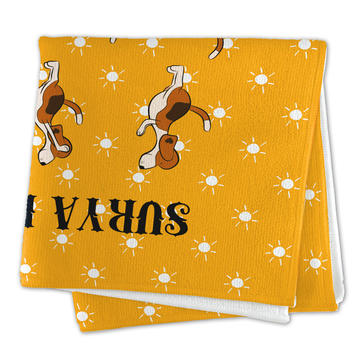 This design has a bright and happy background with little suns that are light yellow, while the rest is a slightly darker bright yellow. The main piece of the design is the set of adorable dogs doing yoga in several different positions. Your personalization goes above and below these graphics.