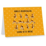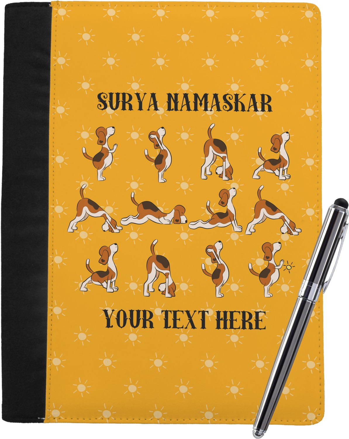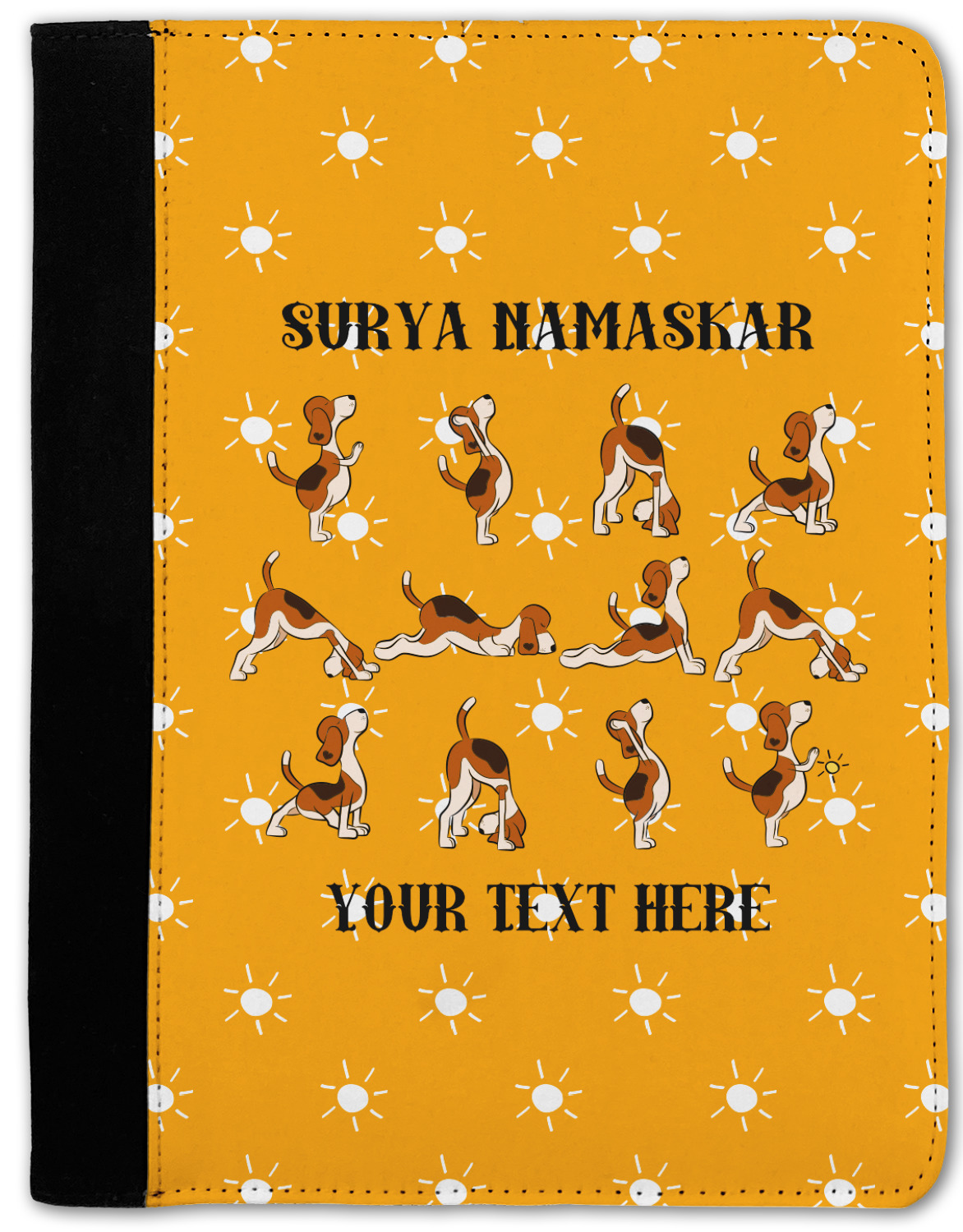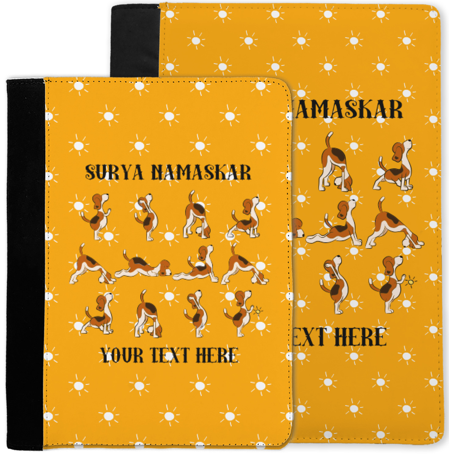 This design has a bright and happy background with little suns that are light yellow, while the rest is a slightly darker bright yellow. The main piece of the design is the set of adorable dogs doing yoga in several different positions. Your personalization goes above and below these graphics.