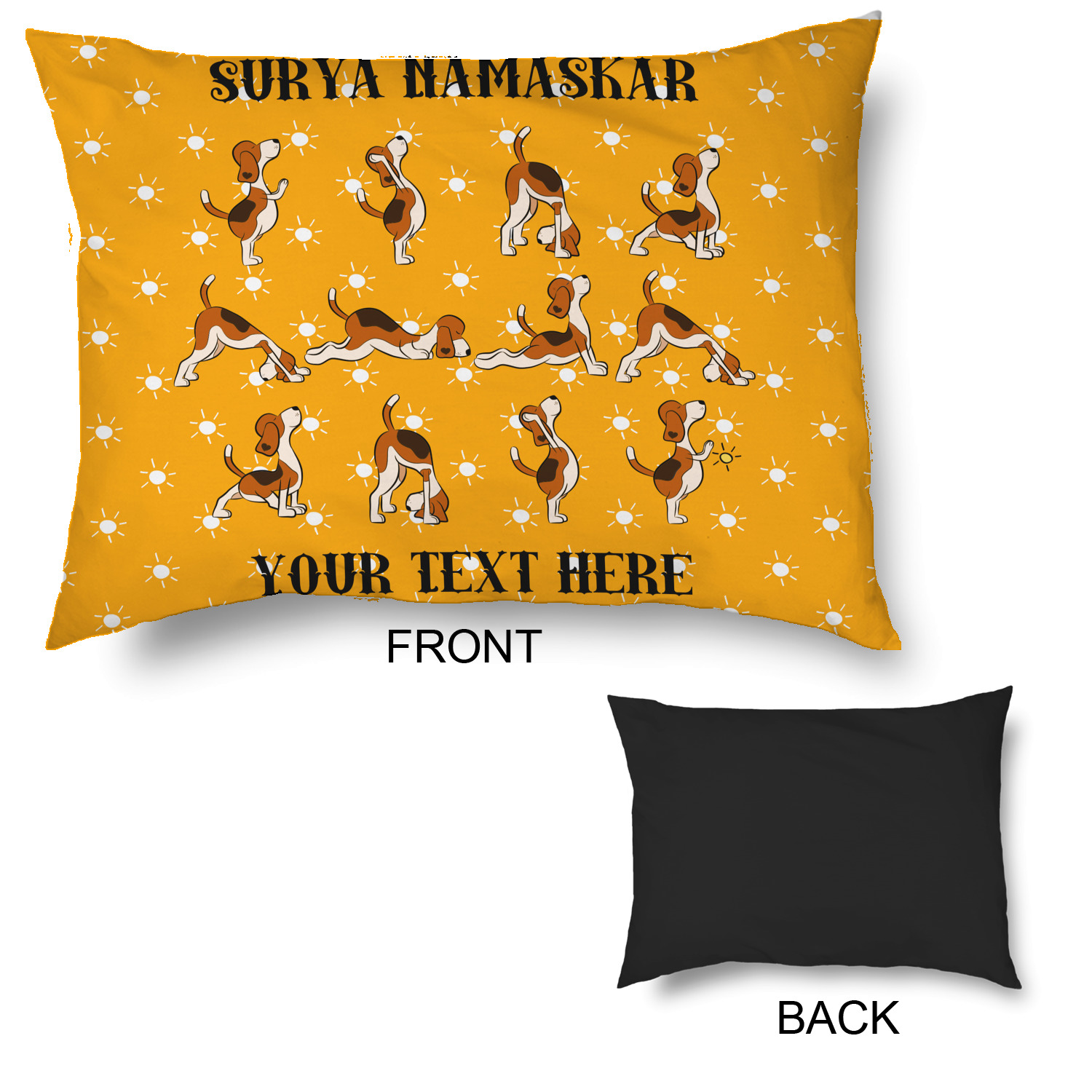 This design has a bright and happy background with little suns that are light yellow, while the rest is a slightly darker bright yellow. The main piece of the design is the set of adorable dogs doing yoga in several different positions. Your personalization goes above and below these graphics.