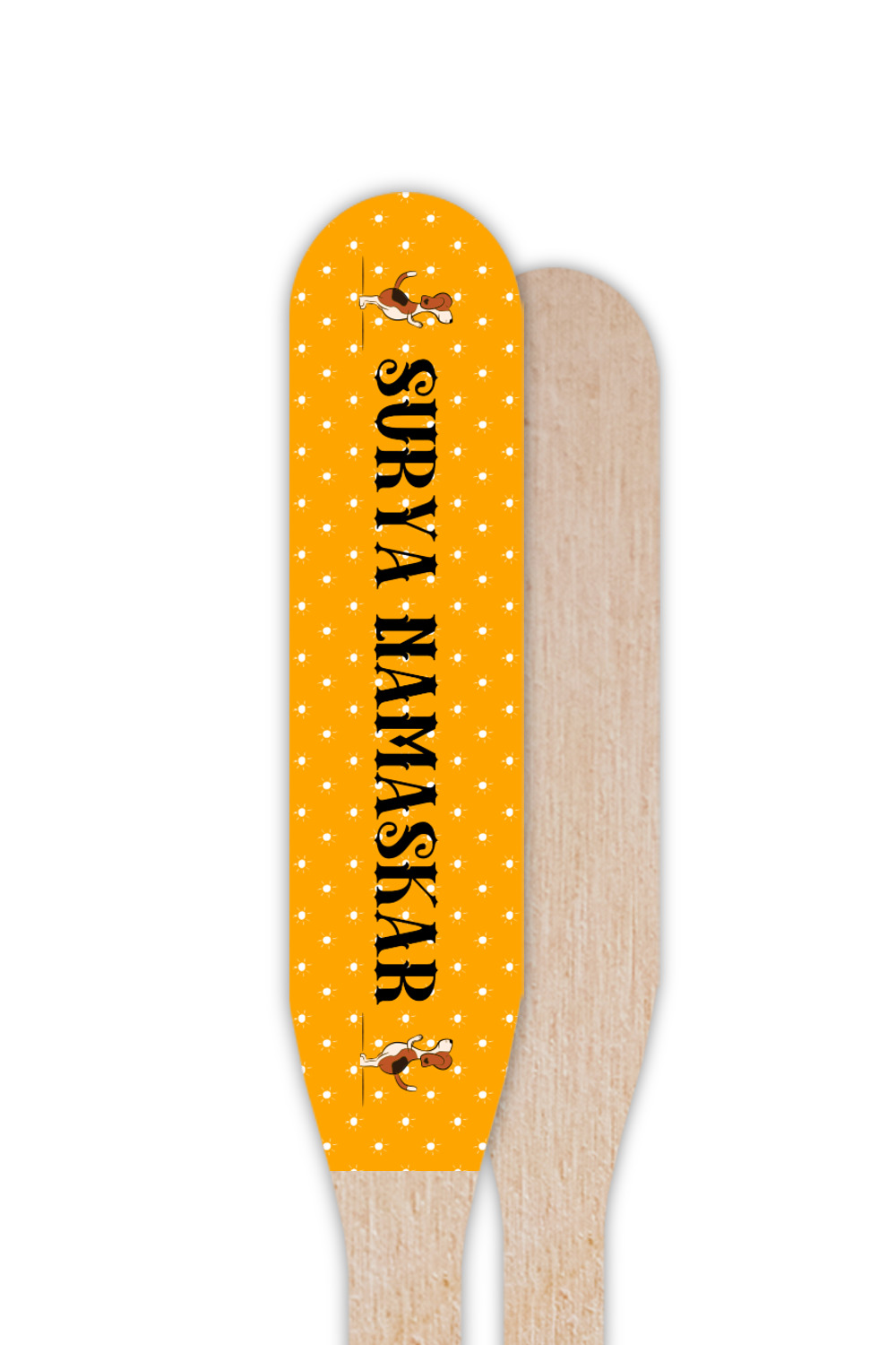 This design has a bright and happy background with little suns that are light yellow, while the rest is a slightly darker bright yellow. The main piece of the design is the set of adorable dogs doing yoga in several different positions. Your personalization goes above and below these graphics.