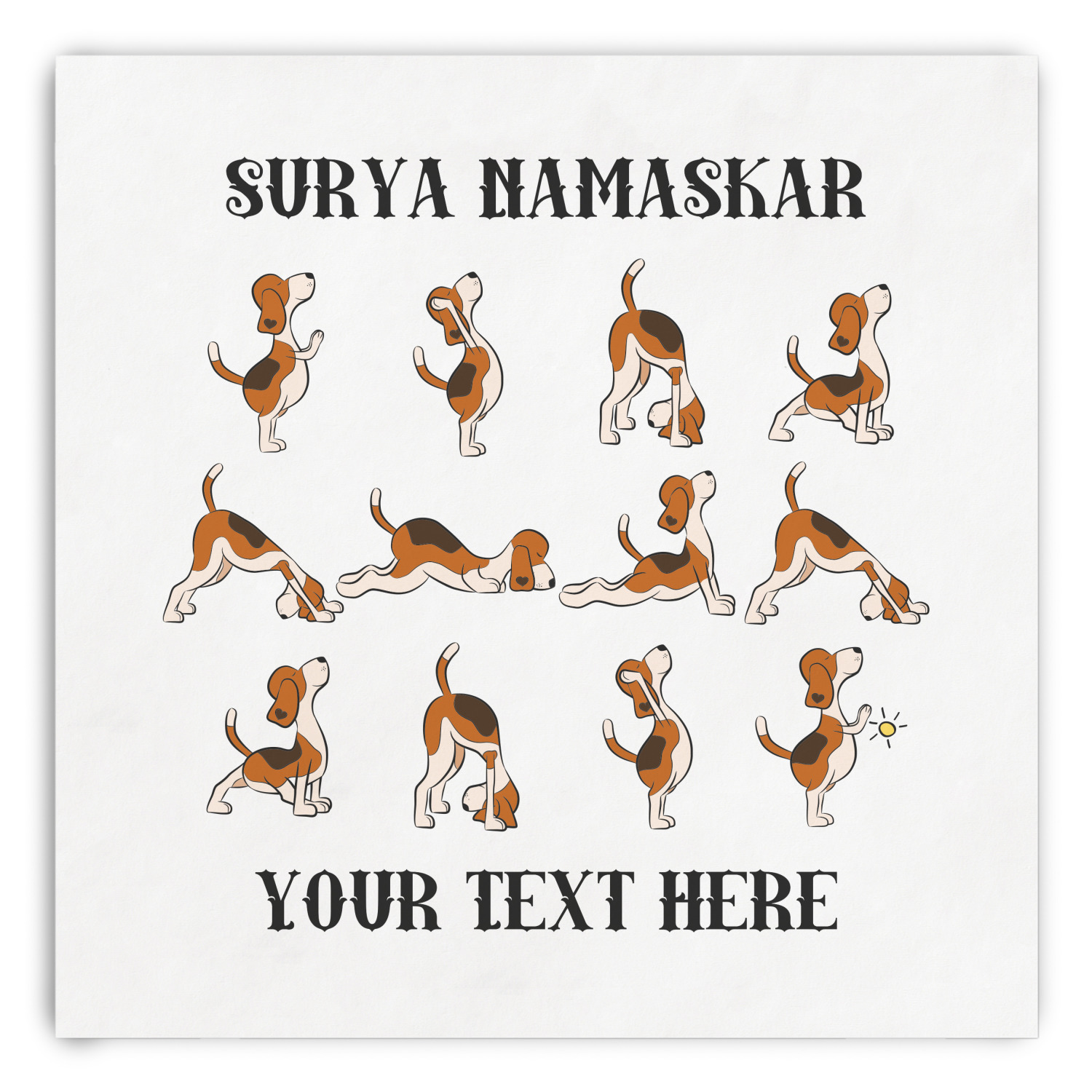 This design has a bright and happy background with little suns that are light yellow, while the rest is a slightly darker bright yellow. The main piece of the design is the set of adorable dogs doing yoga in several different positions. Your personalization goes above and below these graphics.