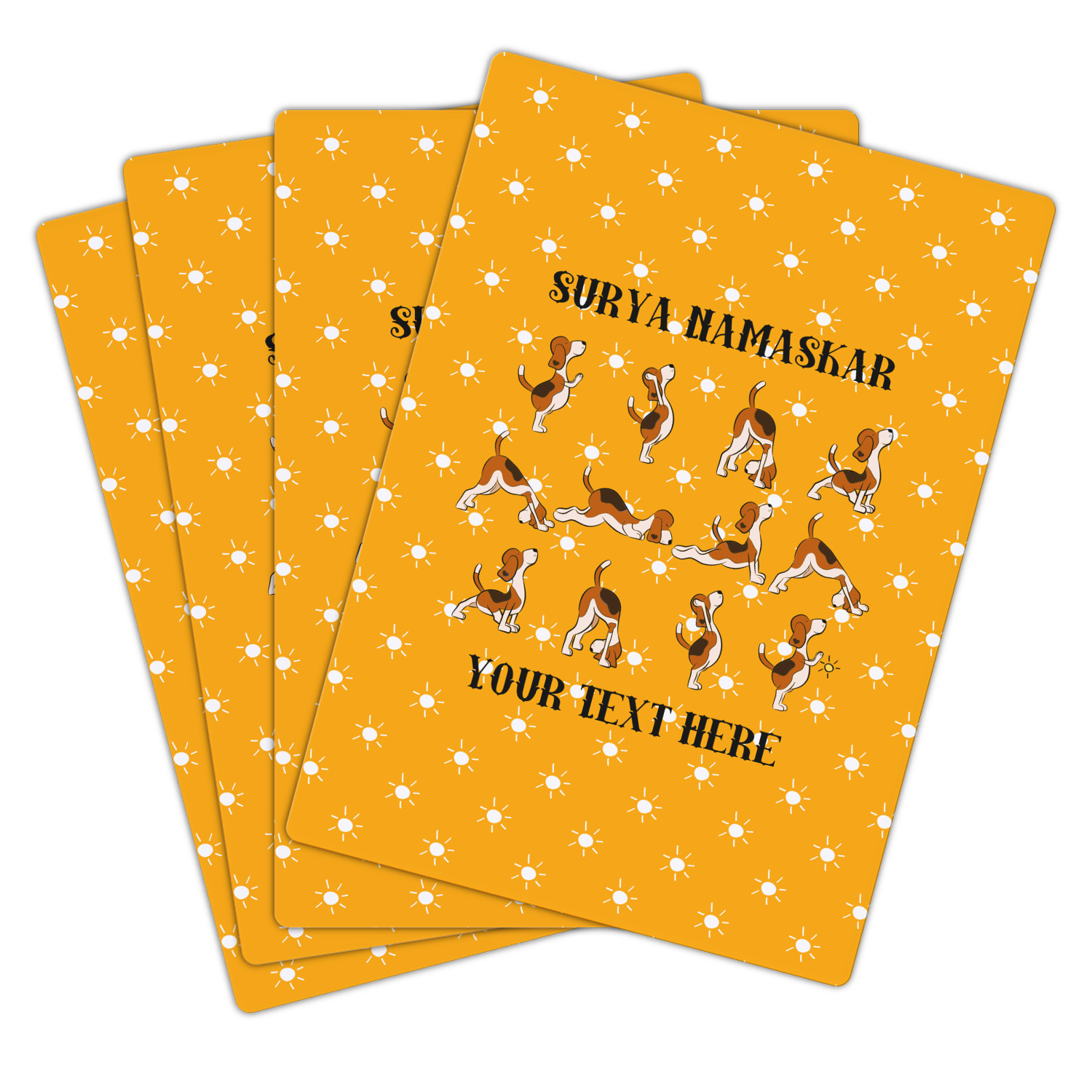 This design has a bright and happy background with little suns that are light yellow, while the rest is a slightly darker bright yellow. The main piece of the design is the set of adorable dogs doing yoga in several different positions. Your personalization goes above and below these graphics.