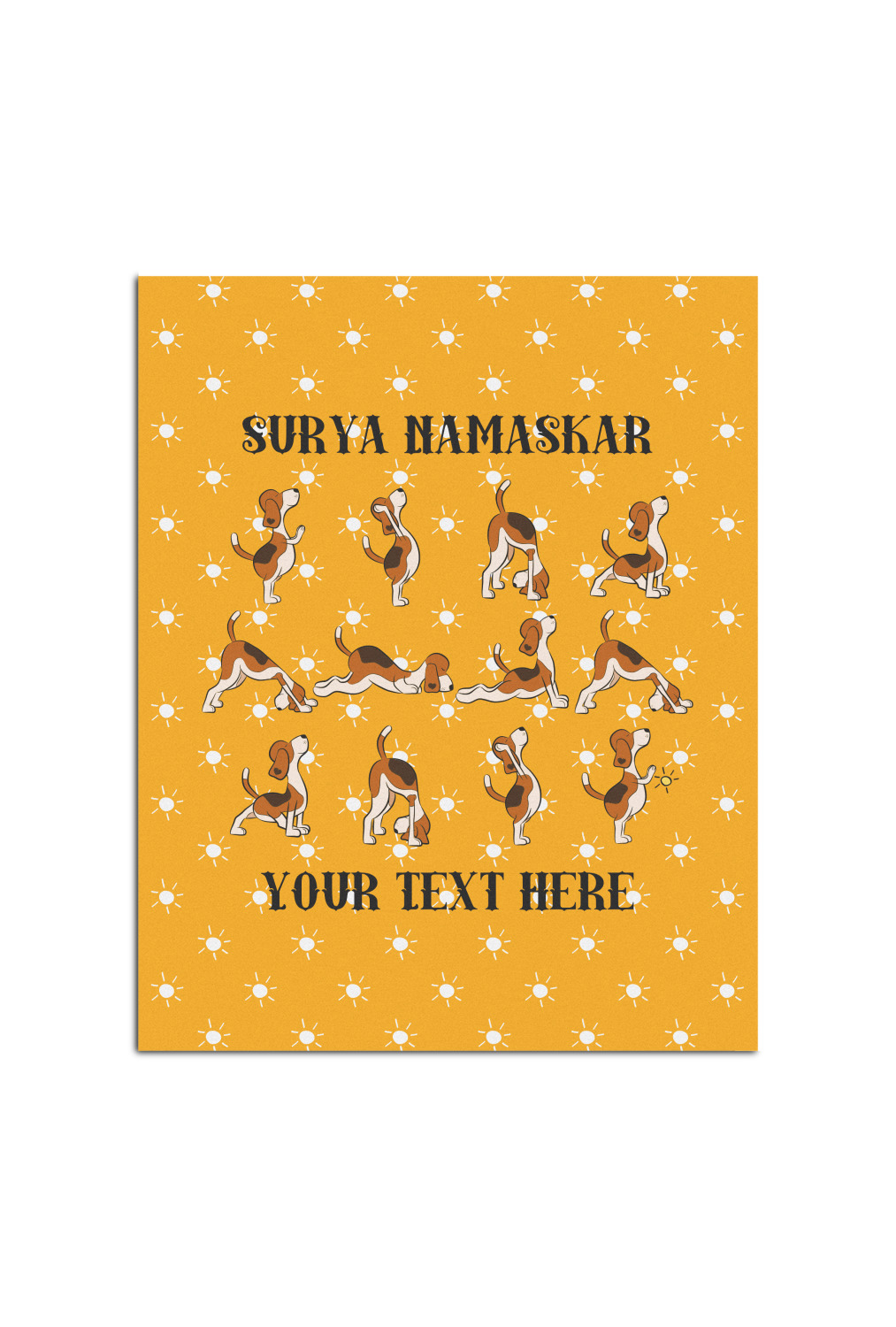This design has a bright and happy background with little suns that are light yellow, while the rest is a slightly darker bright yellow. The main piece of the design is the set of adorable dogs doing yoga in several different positions. Your personalization goes above and below these graphics.