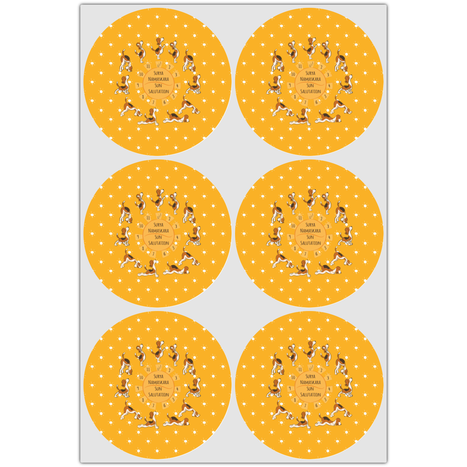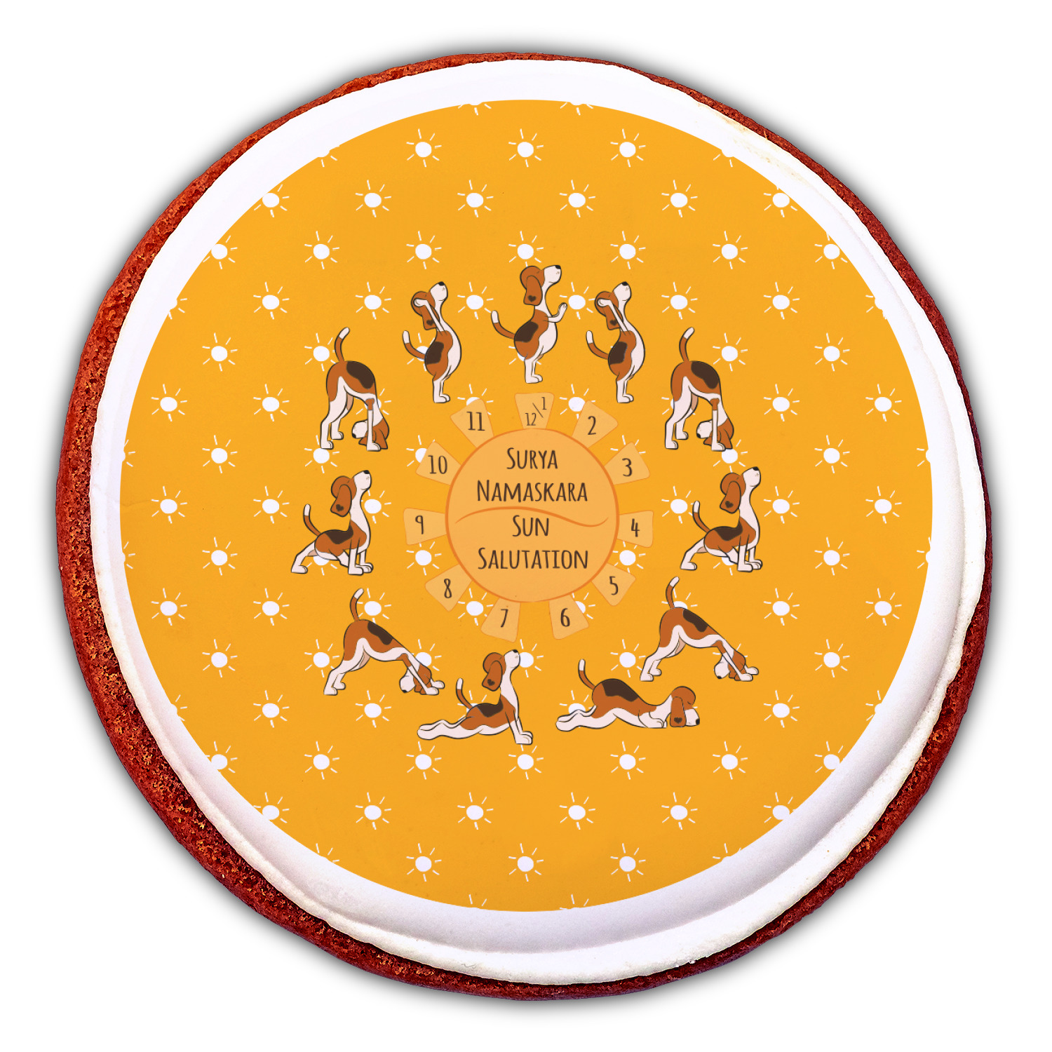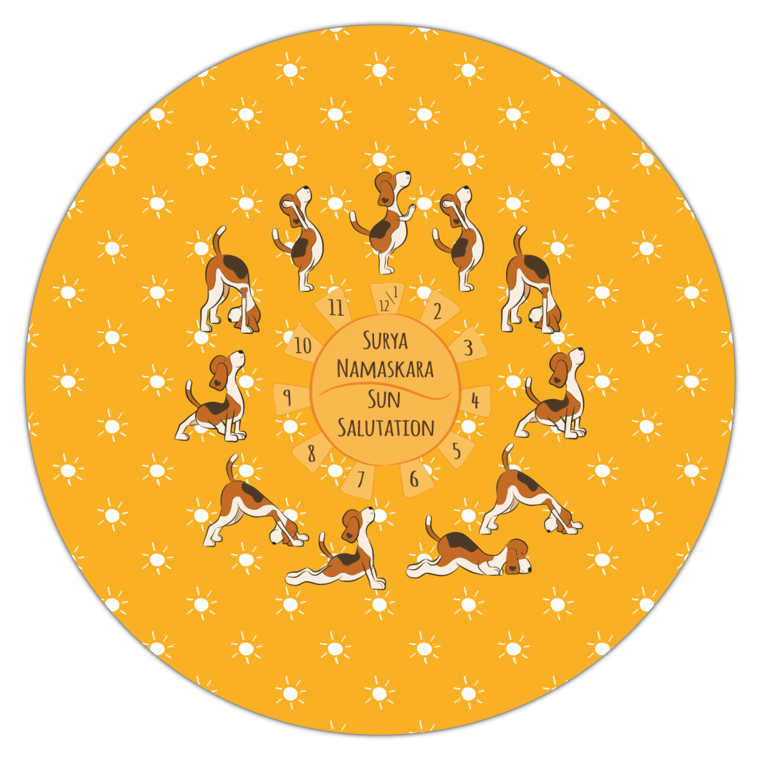 This design has a bright and happy background with little suns that are light yellow, while the rest is a slightly darker bright yellow. The main piece of the design is the set of adorable dogs doing yoga in several different positions. Your personalization goes above and below these graphics.