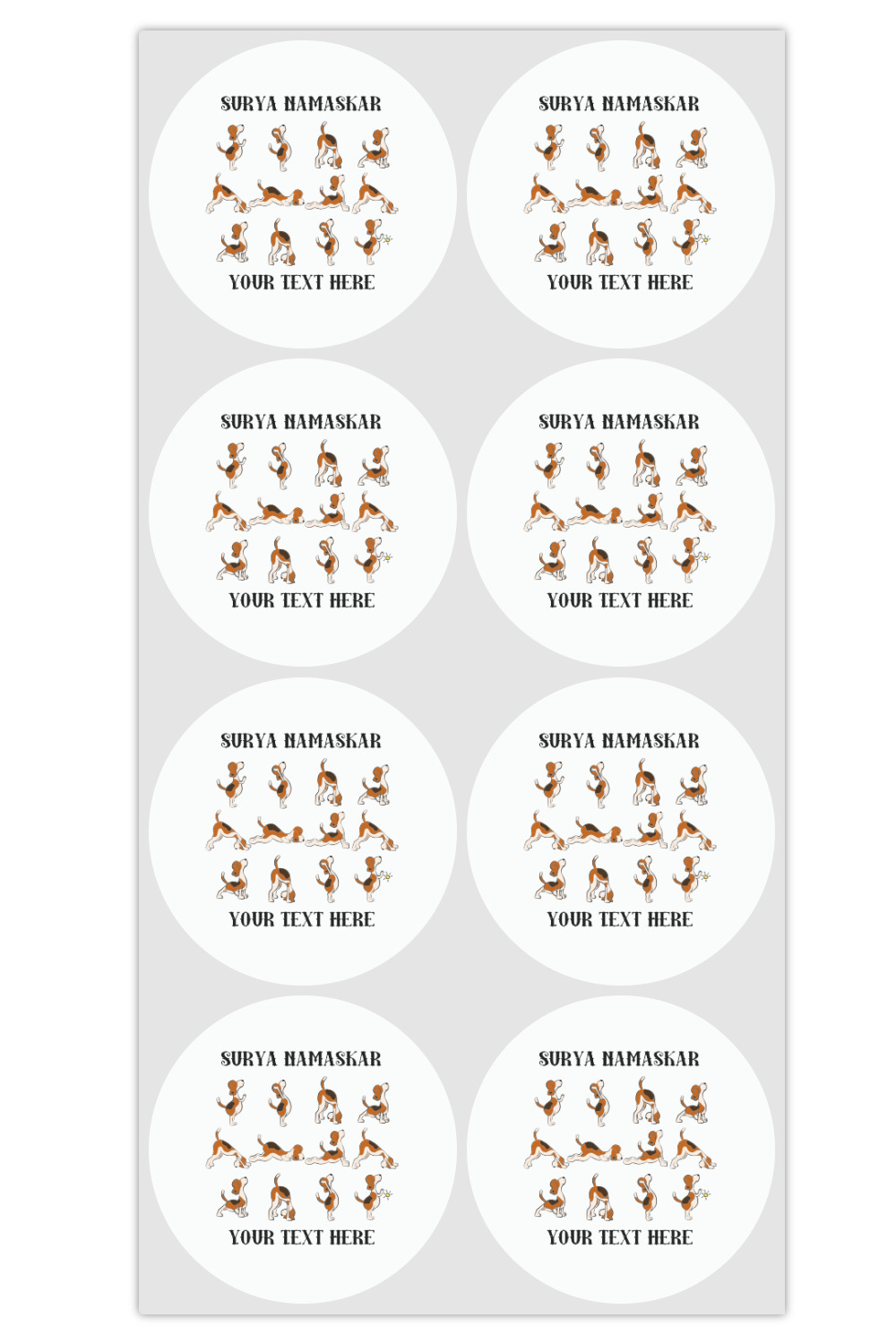 This design has a bright and happy background with little suns that are light yellow, while the rest is a slightly darker bright yellow. The main piece of the design is the set of adorable dogs doing yoga in several different positions. Your personalization goes above and below these graphics.