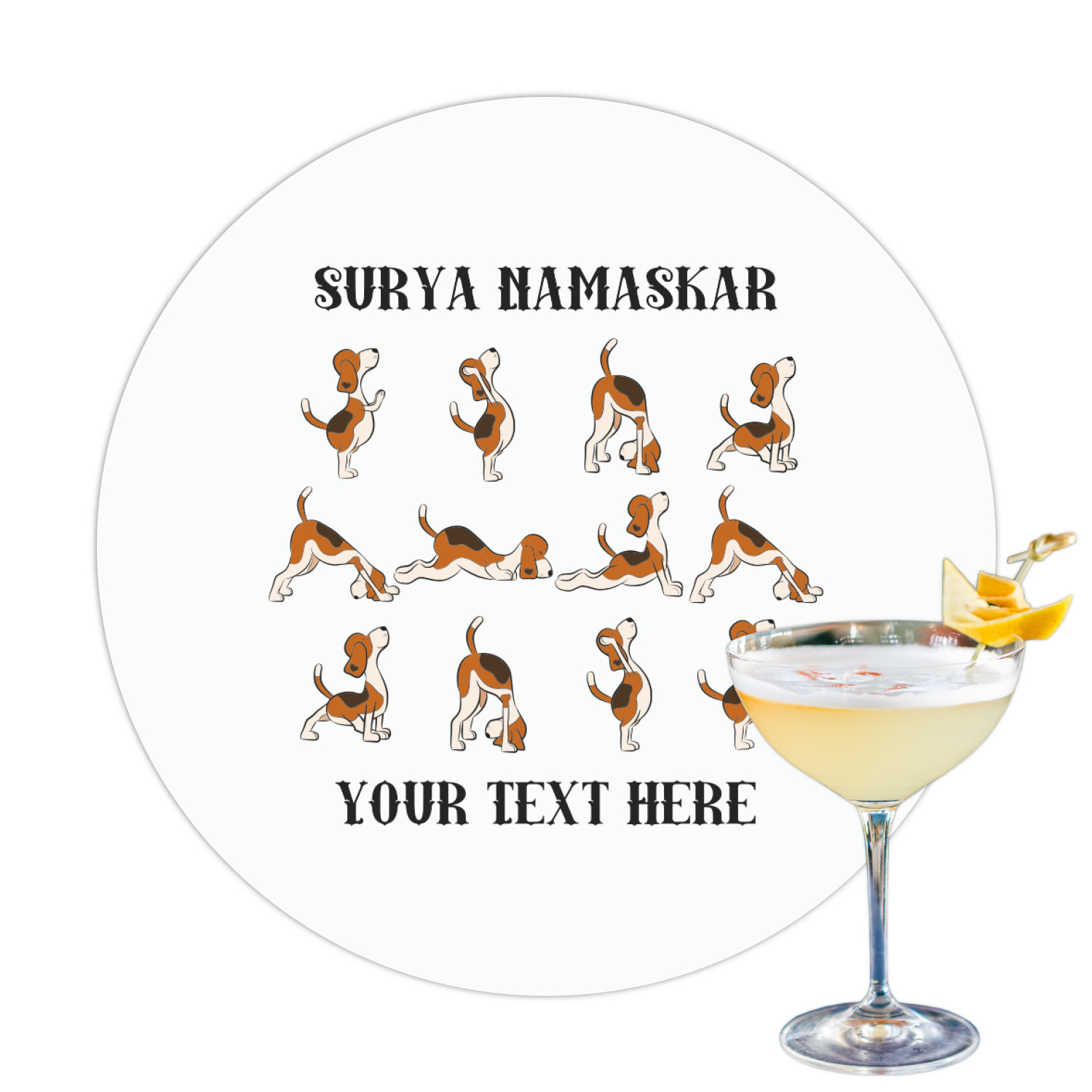 This design has a bright and happy background with little suns that are light yellow, while the rest is a slightly darker bright yellow. The main piece of the design is the set of adorable dogs doing yoga in several different positions. Your personalization goes above and below these graphics.