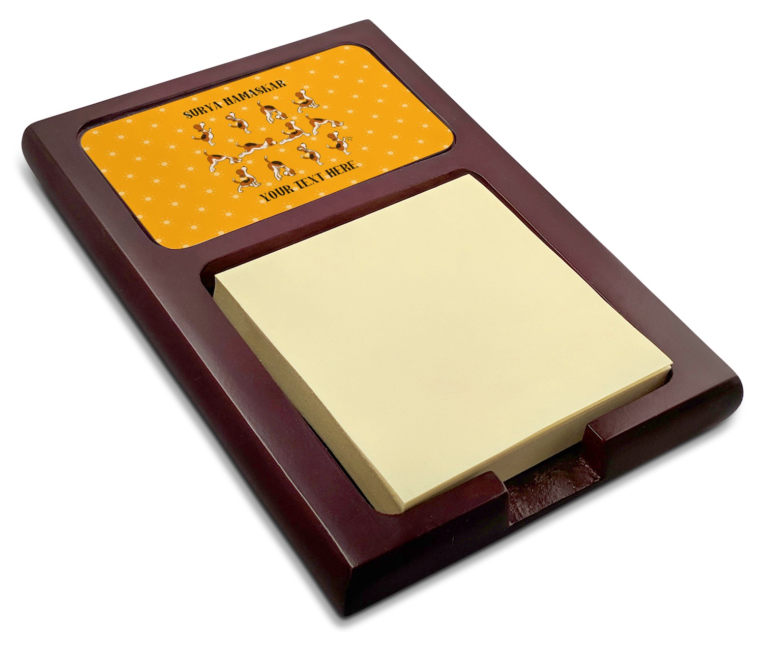 Crafted from a fine mahogany, this post it note holder is in the shade of a dark, cherry color. The dispenser itself is about 4.25 by 6.25 by 0.75 inches. You can place your 3 by 3 inch sticky notes in the indentation below the nameplate. We print your customization onto the nameplate that rests above the velvety indentation.