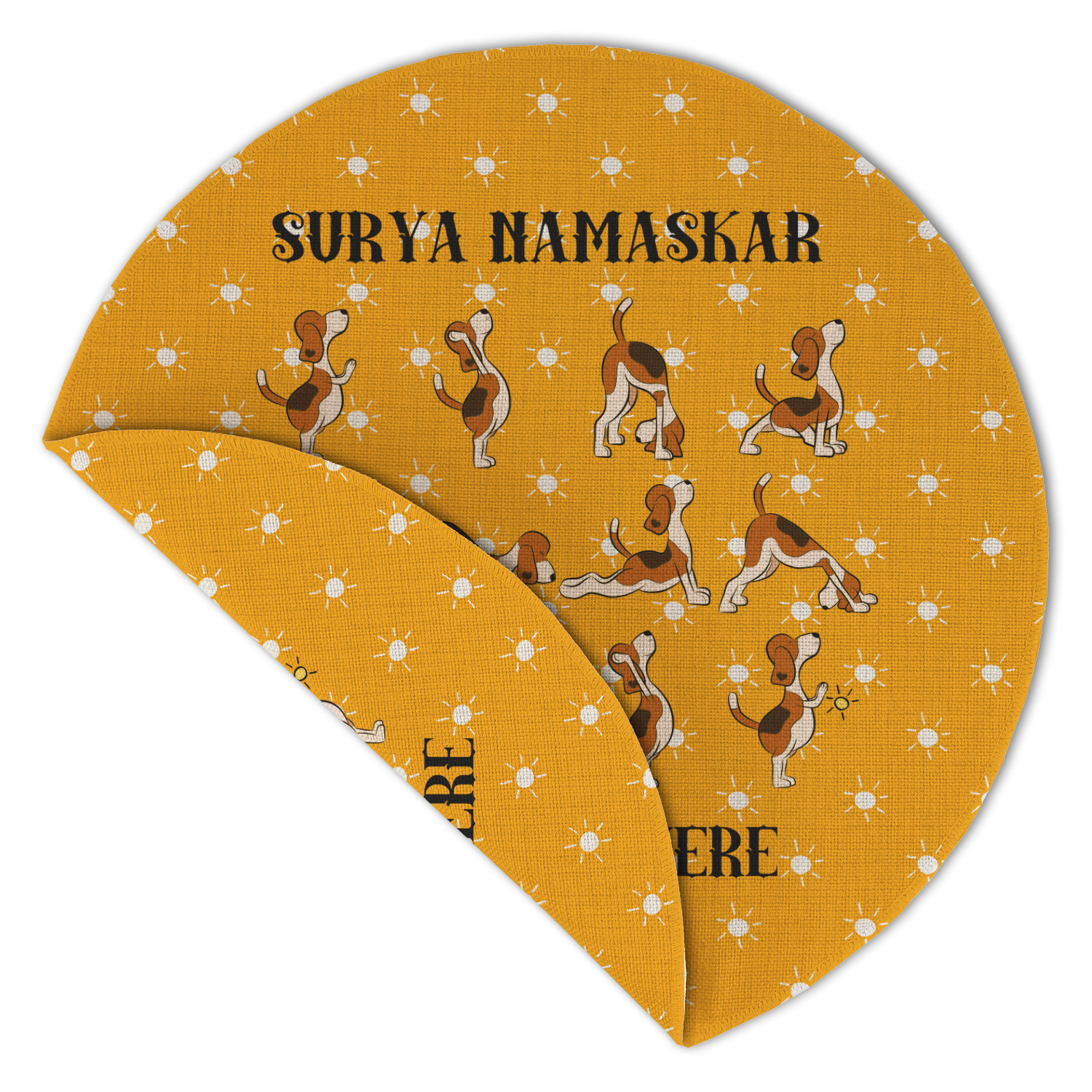 This design has a bright and happy background with little suns that are light yellow, while the rest is a slightly darker bright yellow. The main piece of the design is the set of adorable dogs doing yoga in several different positions. Your personalization goes above and below these graphics.