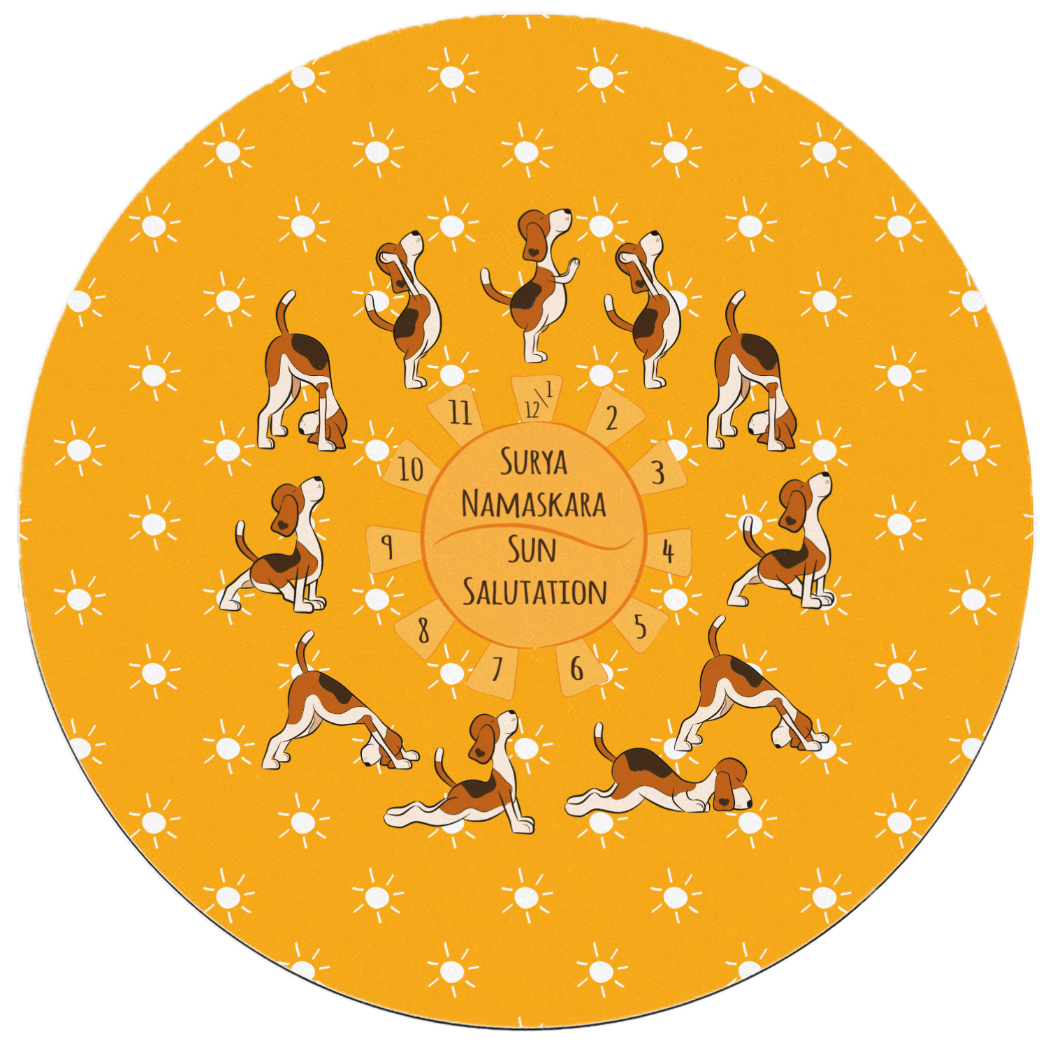 This design has a bright and happy background with little suns that are light yellow, while the rest is a slightly darker bright yellow. The main piece of the design is the set of adorable dogs doing yoga in several different positions. Your personalization goes above and below these graphics.