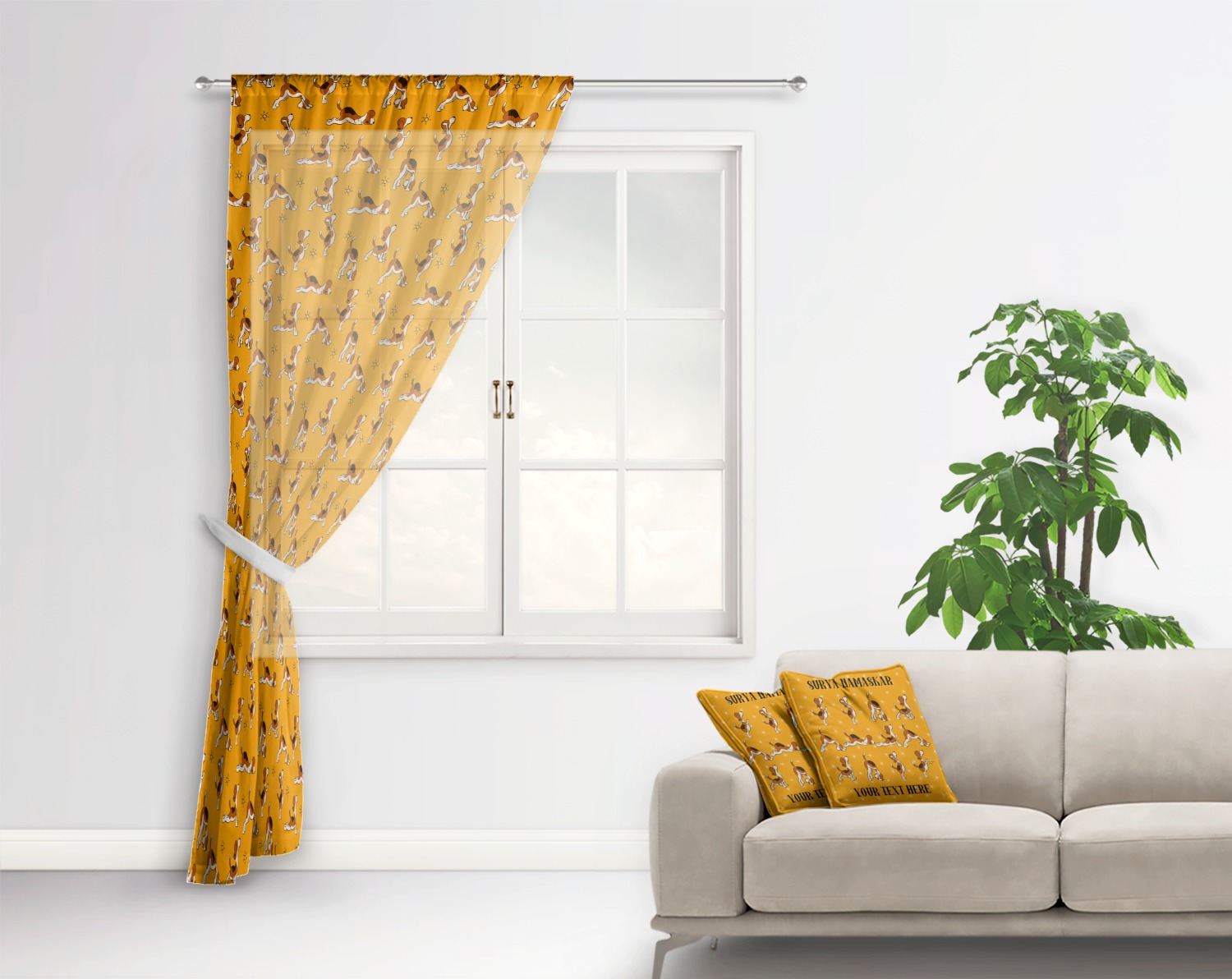 This design has a bright and happy background with little suns that are light yellow, while the rest is a slightly darker bright yellow. The main piece of the design is the set of adorable dogs doing yoga in several different positions. Your personalization goes above and below these graphics.