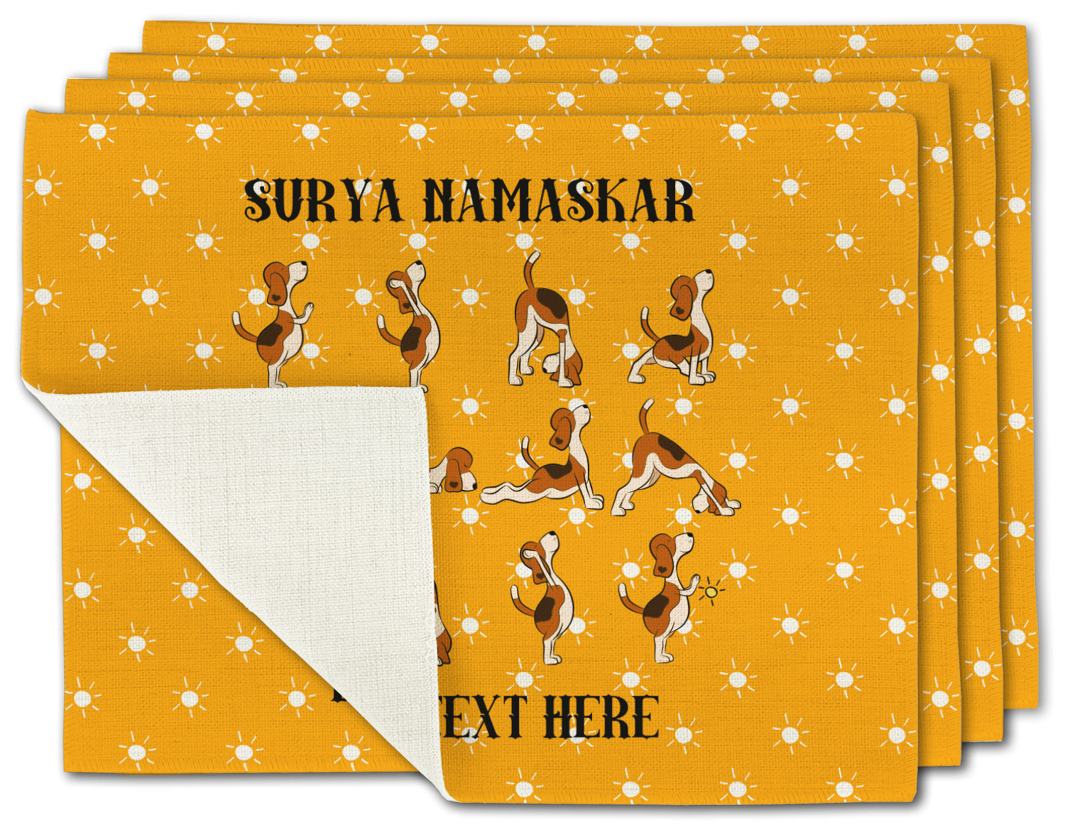 This design has a bright and happy background with little suns that are light yellow, while the rest is a slightly darker bright yellow. The main piece of the design is the set of adorable dogs doing yoga in several different positions. Your personalization goes above and below these graphics.