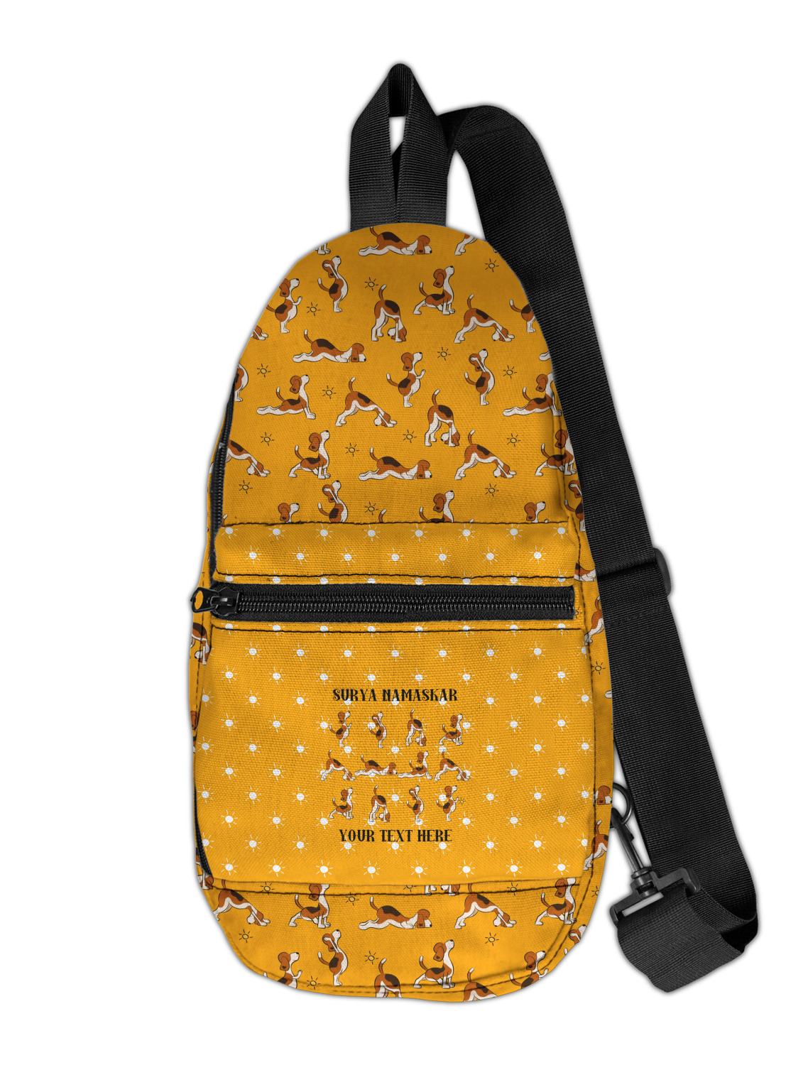 This design has a bright and happy background with little suns that are light yellow, while the rest is a slightly darker bright yellow. The main piece of the design is the set of adorable dogs doing yoga in several different positions. Your personalization goes above and below these graphics.