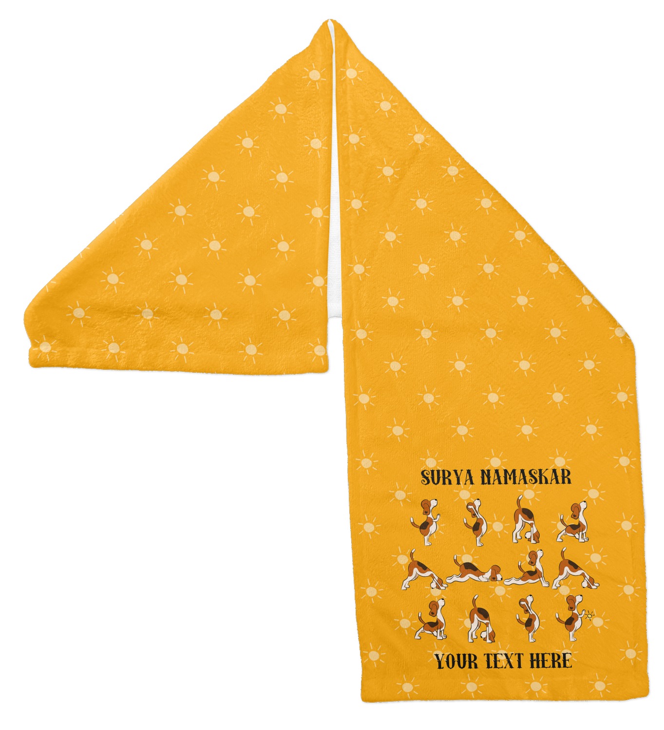 This design has a bright and happy background with little suns that are light yellow, while the rest is a slightly darker bright yellow. The main piece of the design is the set of adorable dogs doing yoga in several different positions. Your personalization goes above and below these graphics.