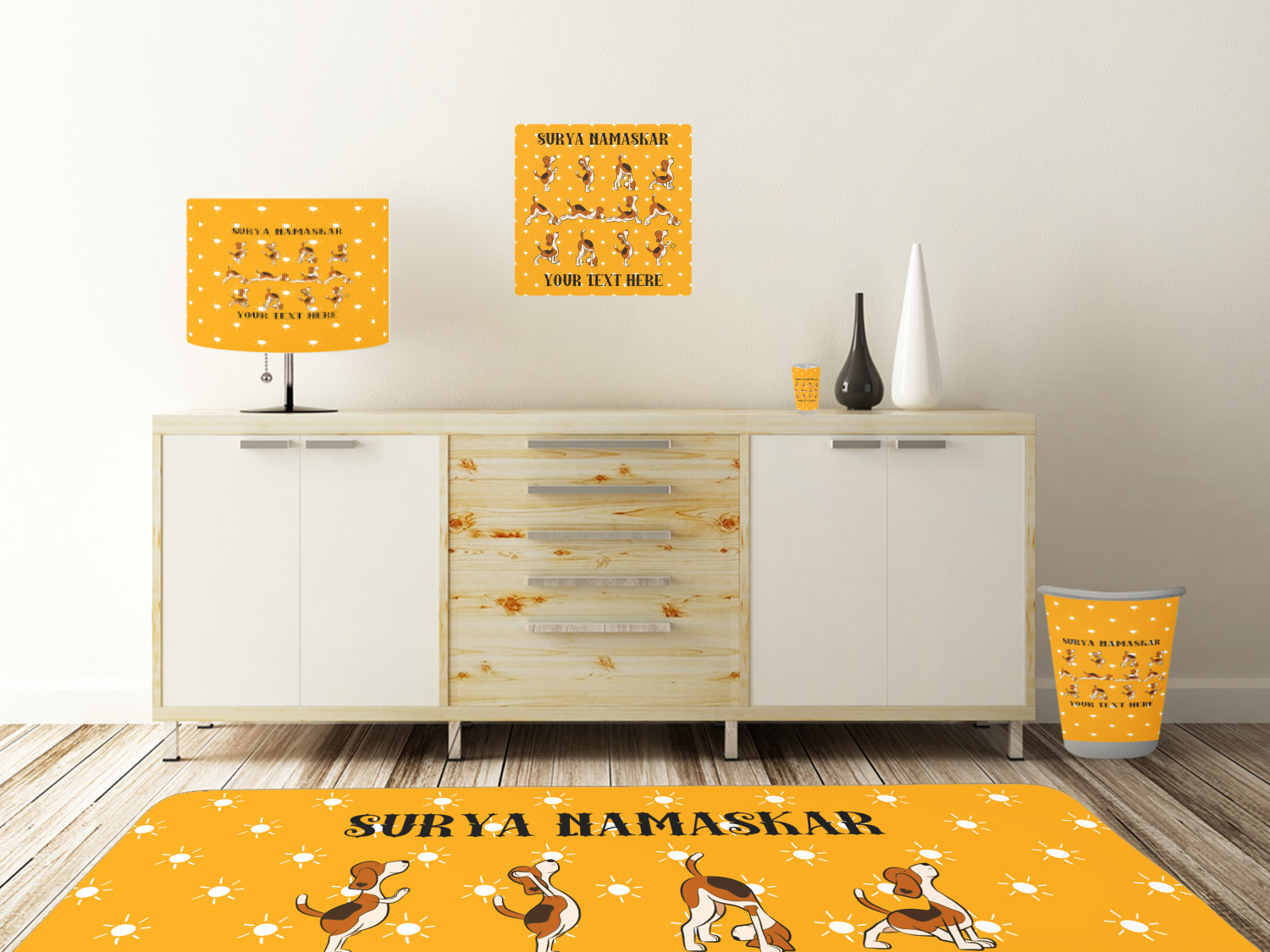 This design has a bright and happy background with little suns that are light yellow, while the rest is a slightly darker bright yellow. The main piece of the design is the set of adorable dogs doing yoga in several different positions. Your personalization goes above and below these graphics.