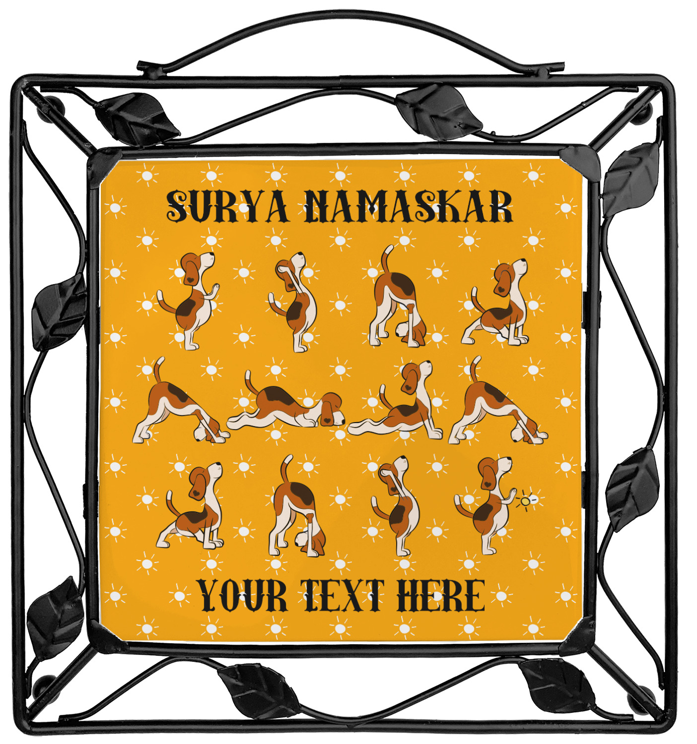 This design has a bright and happy background with little suns that are light yellow, while the rest is a slightly darker bright yellow. The main piece of the design is the set of adorable dogs doing yoga in several different positions. Your personalization goes above and below these graphics.
