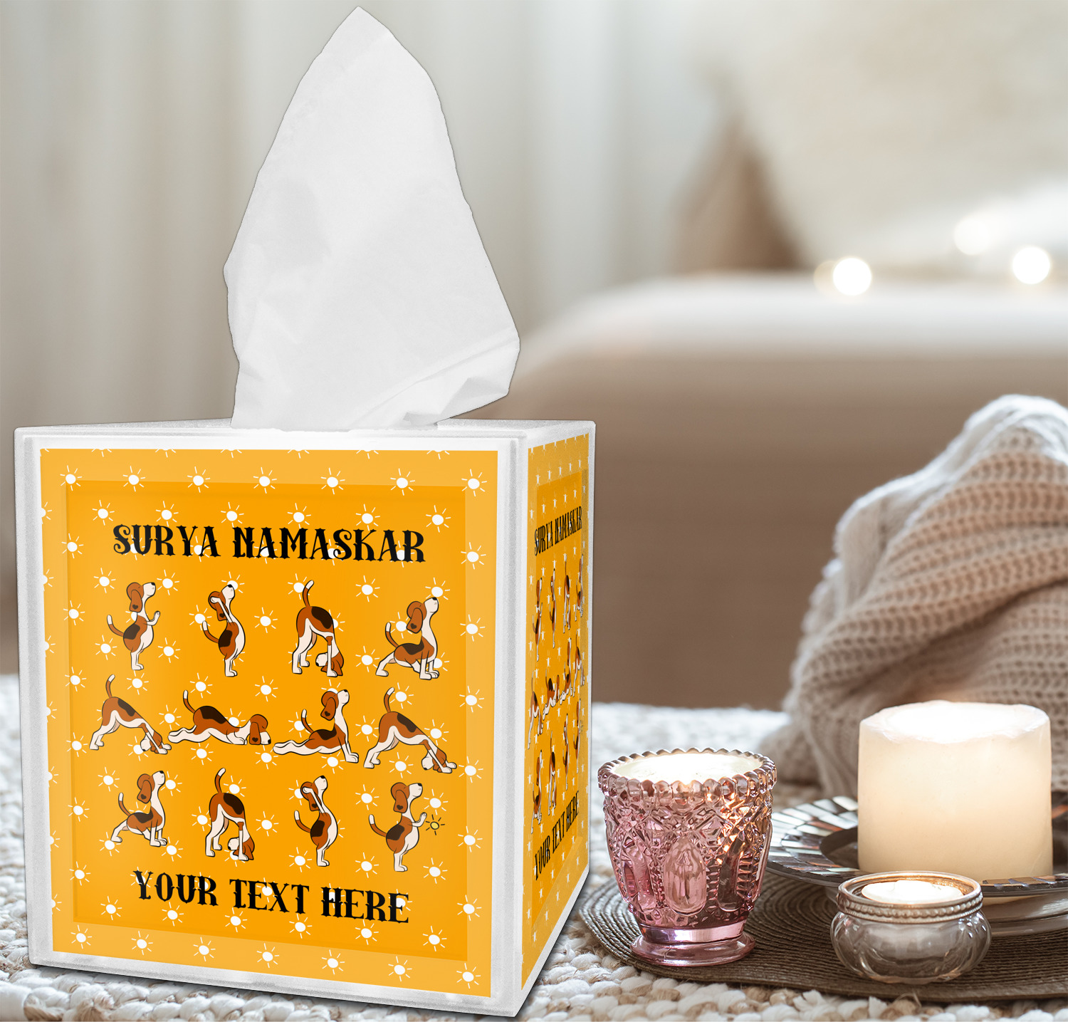 This design has a bright and happy background with little suns that are light yellow, while the rest is a slightly darker bright yellow. The main piece of the design is the set of adorable dogs doing yoga in several different positions. Your personalization goes above and below these graphics.
