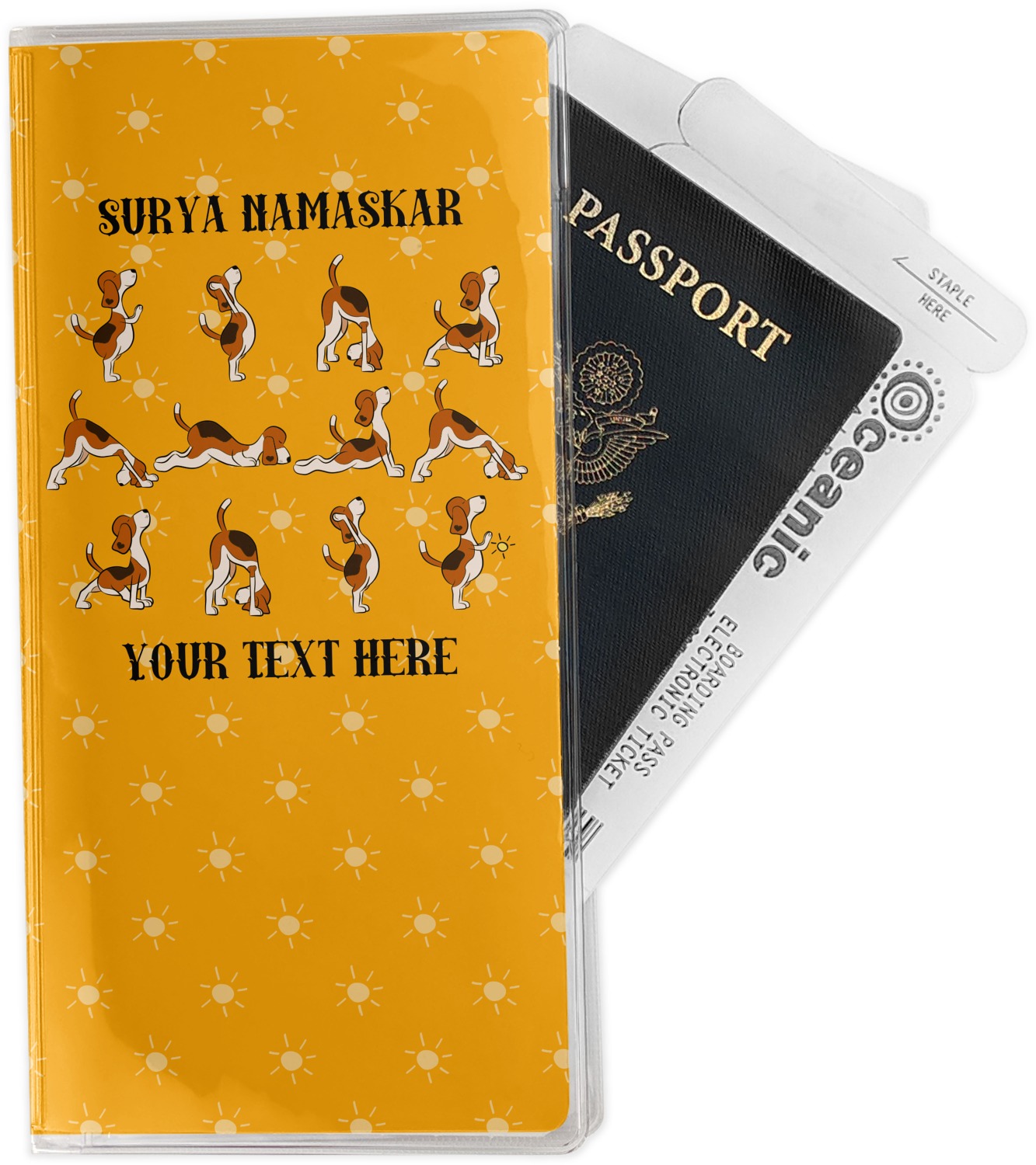 This design has a bright and happy background with little suns that are light yellow, while the rest is a slightly darker bright yellow. The main piece of the design is the set of adorable dogs doing yoga in several different positions. Your personalization goes above and below these graphics.