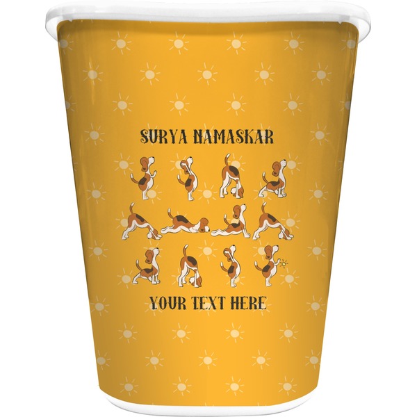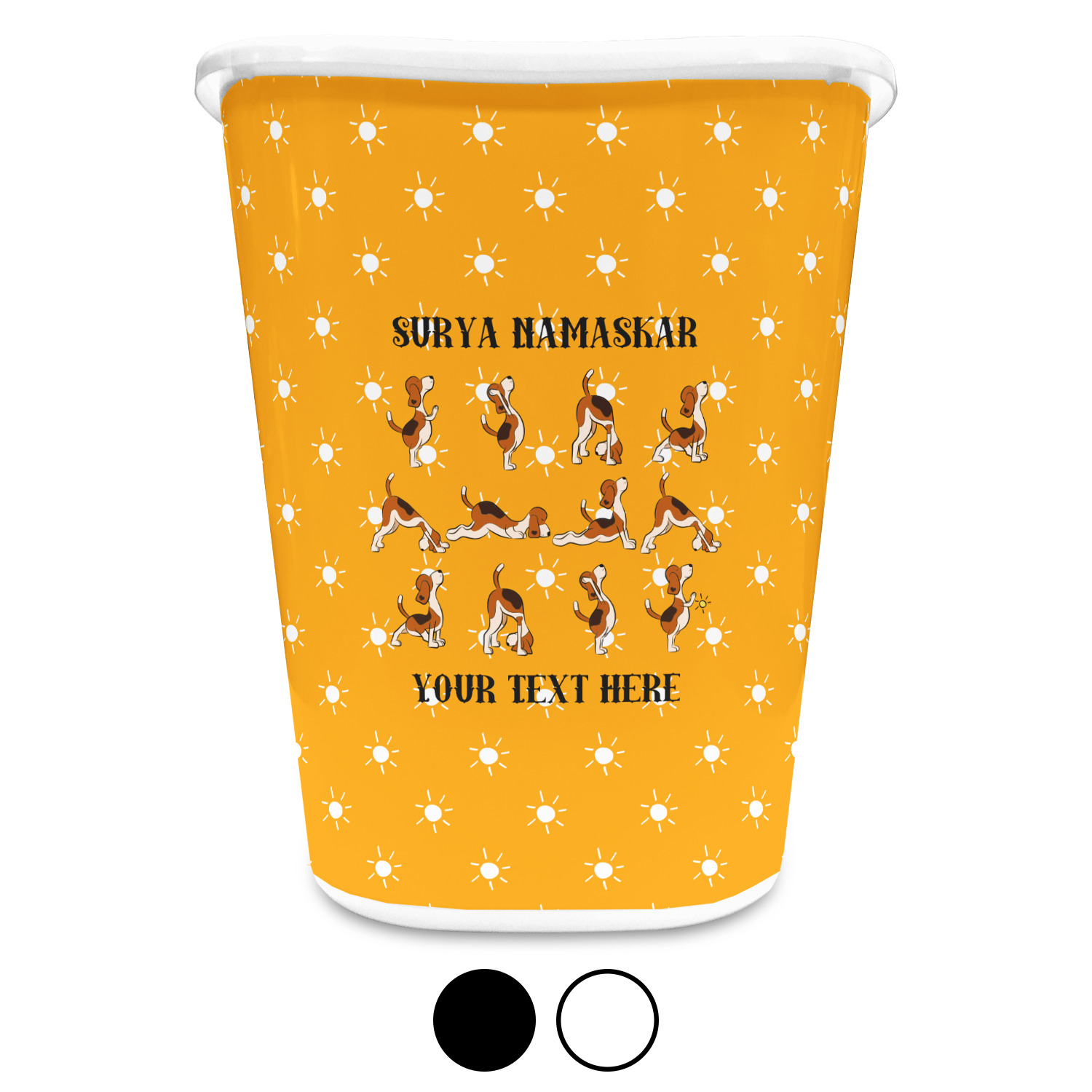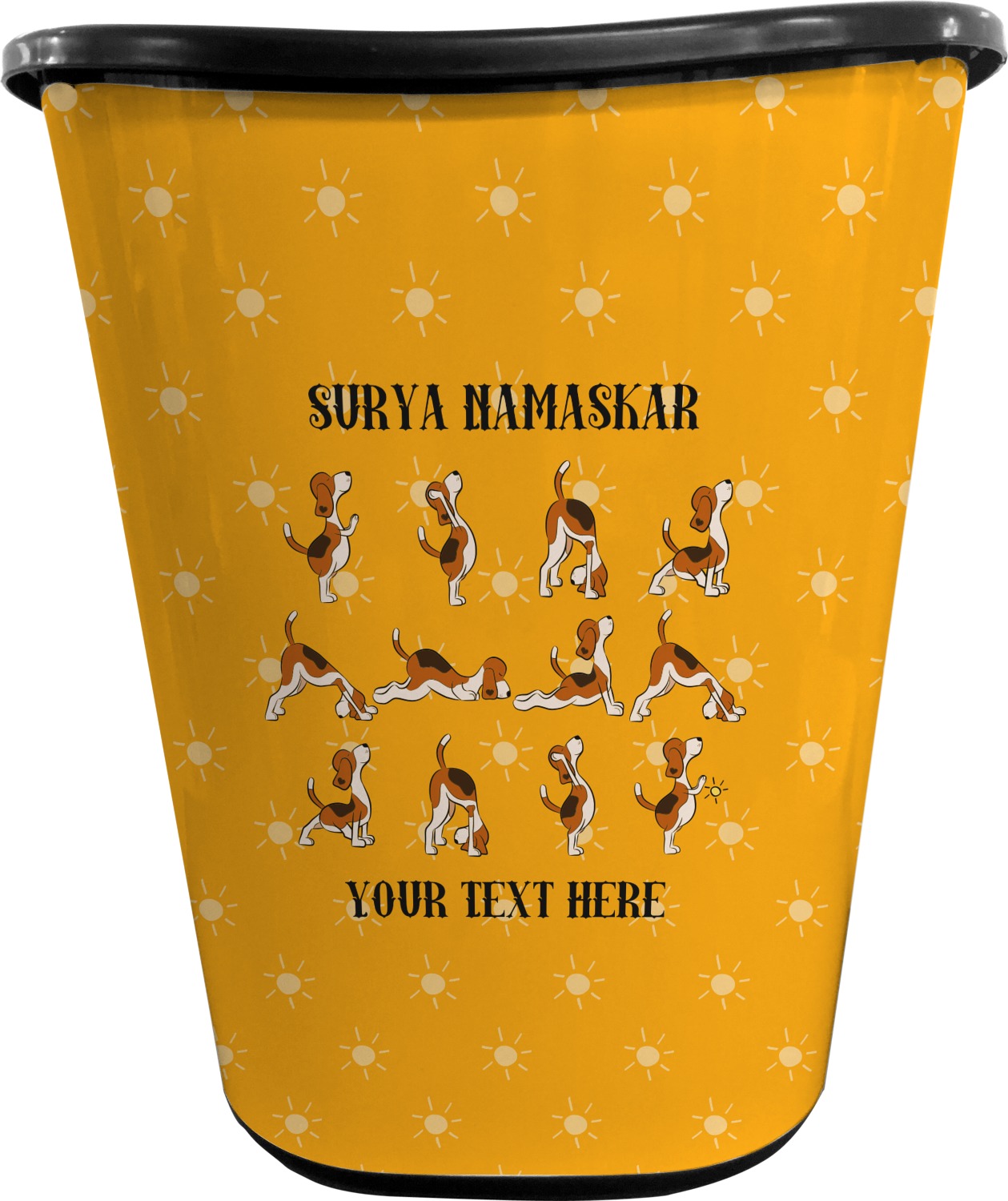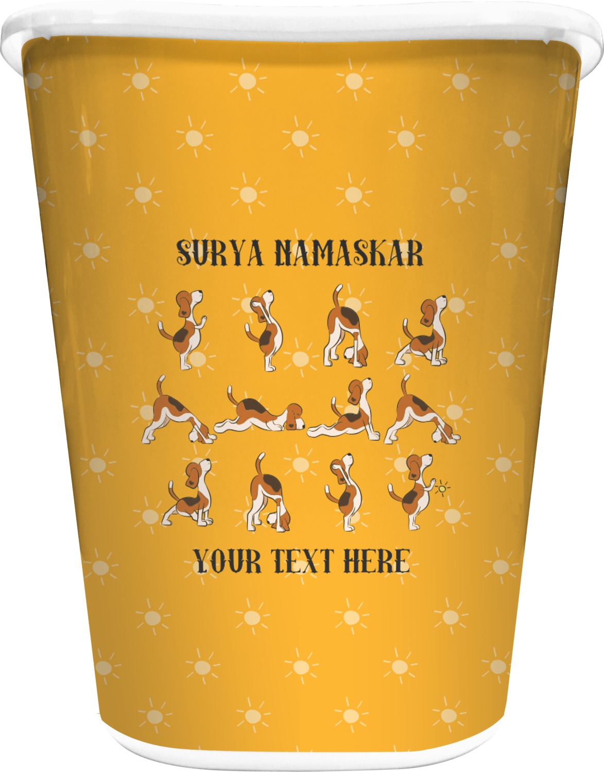 This design has a bright and happy background with little suns that are light yellow, while the rest is a slightly darker bright yellow. The main piece of the design is the set of adorable dogs doing yoga in several different positions. Your personalization goes above and below these graphics.