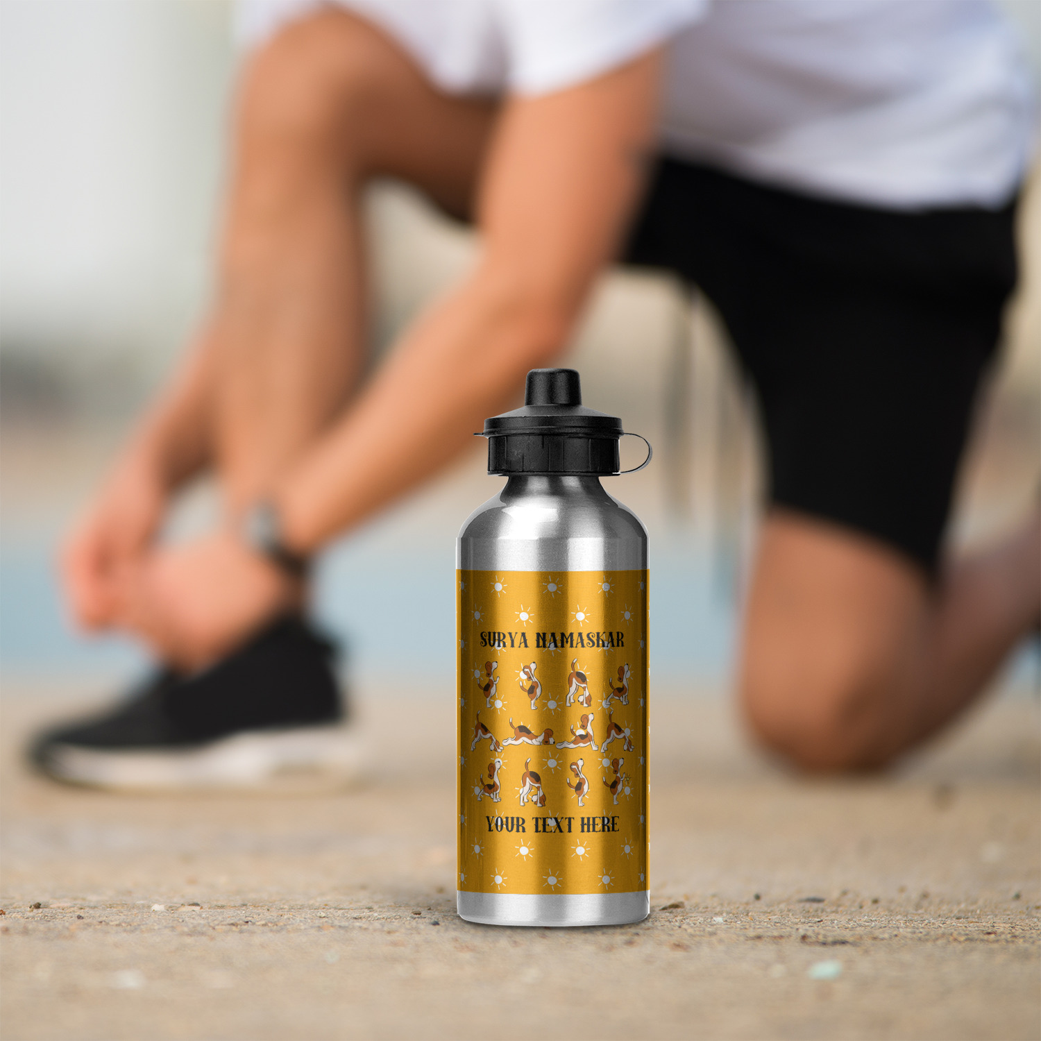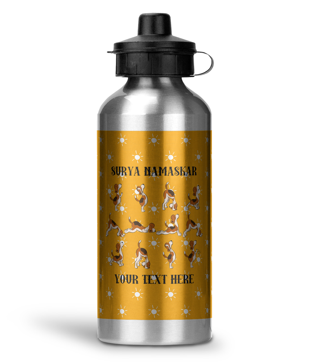 This design has a bright and happy background with little suns that are light yellow, while the rest is a slightly darker bright yellow. The main piece of the design is the set of adorable dogs doing yoga in several different positions. Your personalization goes above and below these graphics.