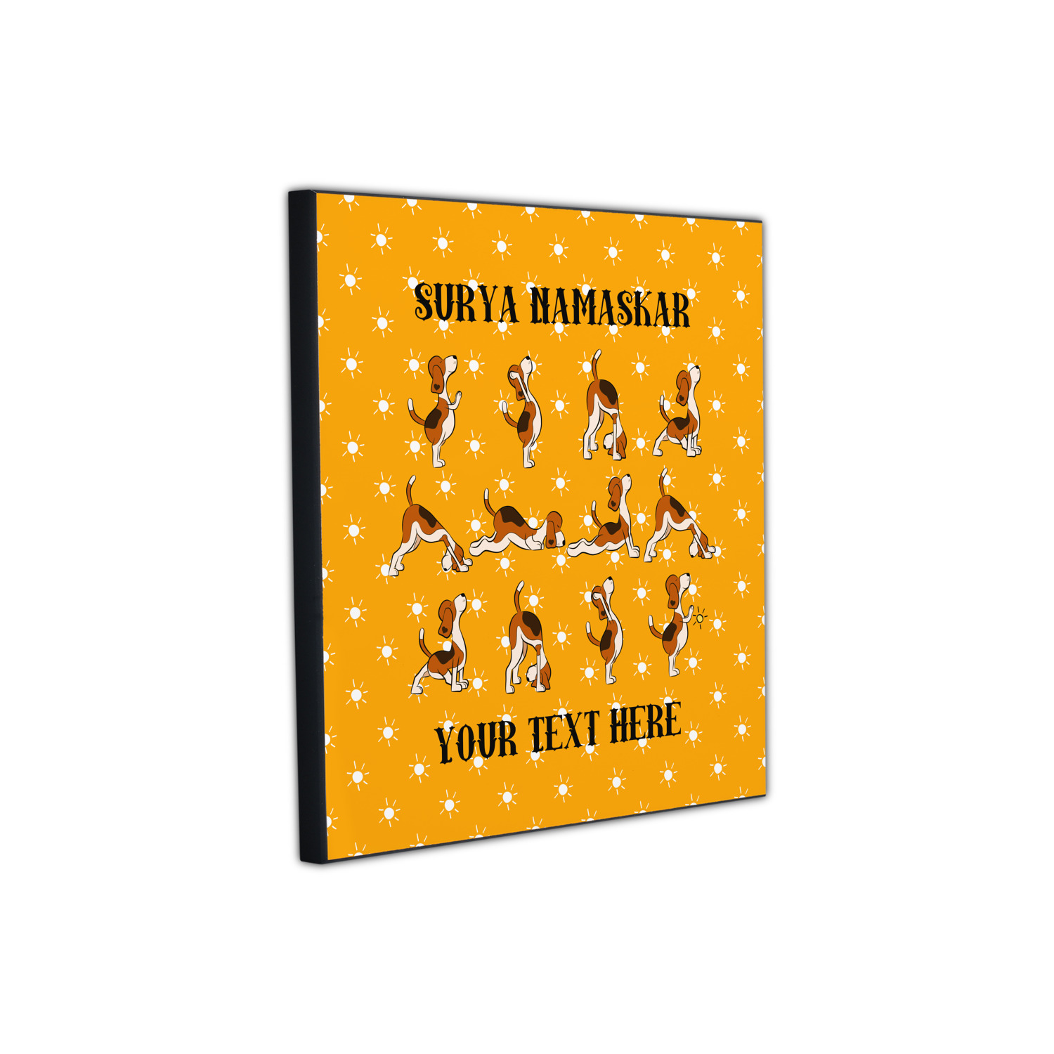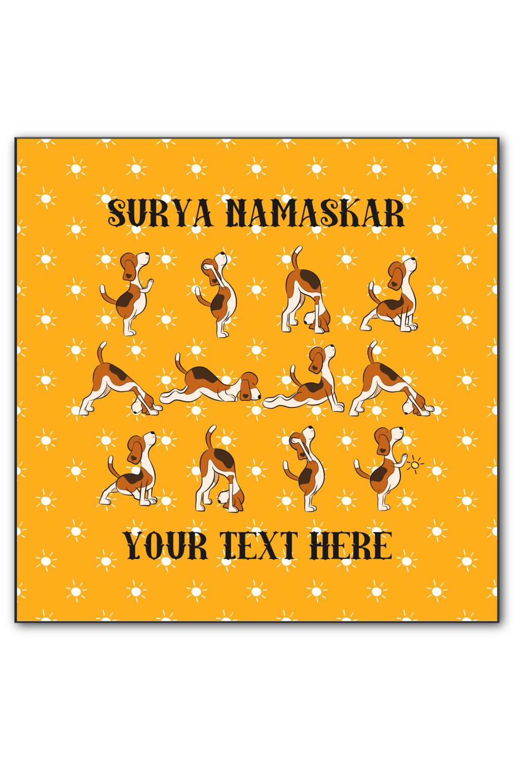 This design has a bright and happy background with little suns that are light yellow, while the rest is a slightly darker bright yellow. The main piece of the design is the set of adorable dogs doing yoga in several different positions. Your personalization goes above and below these graphics.