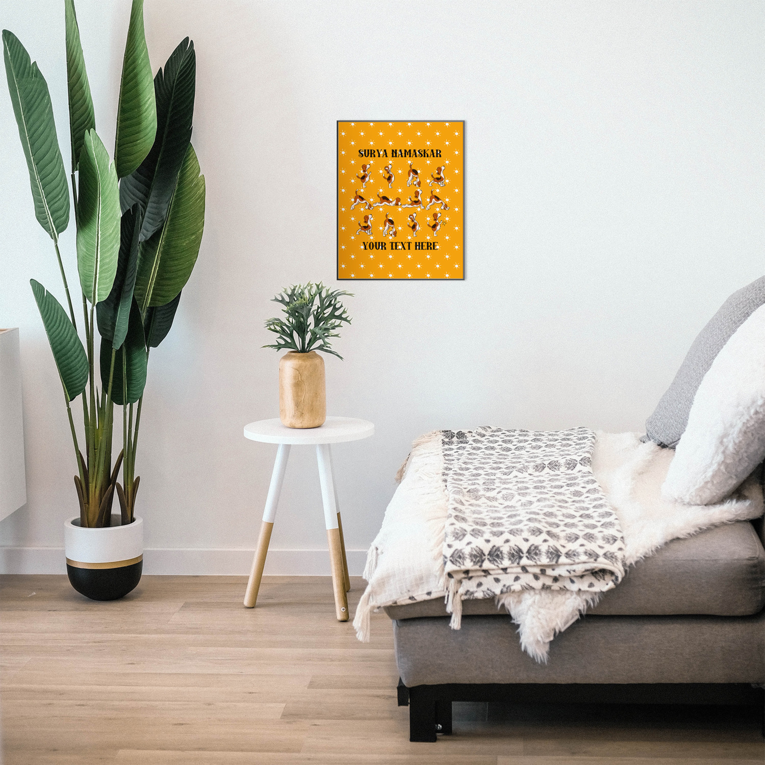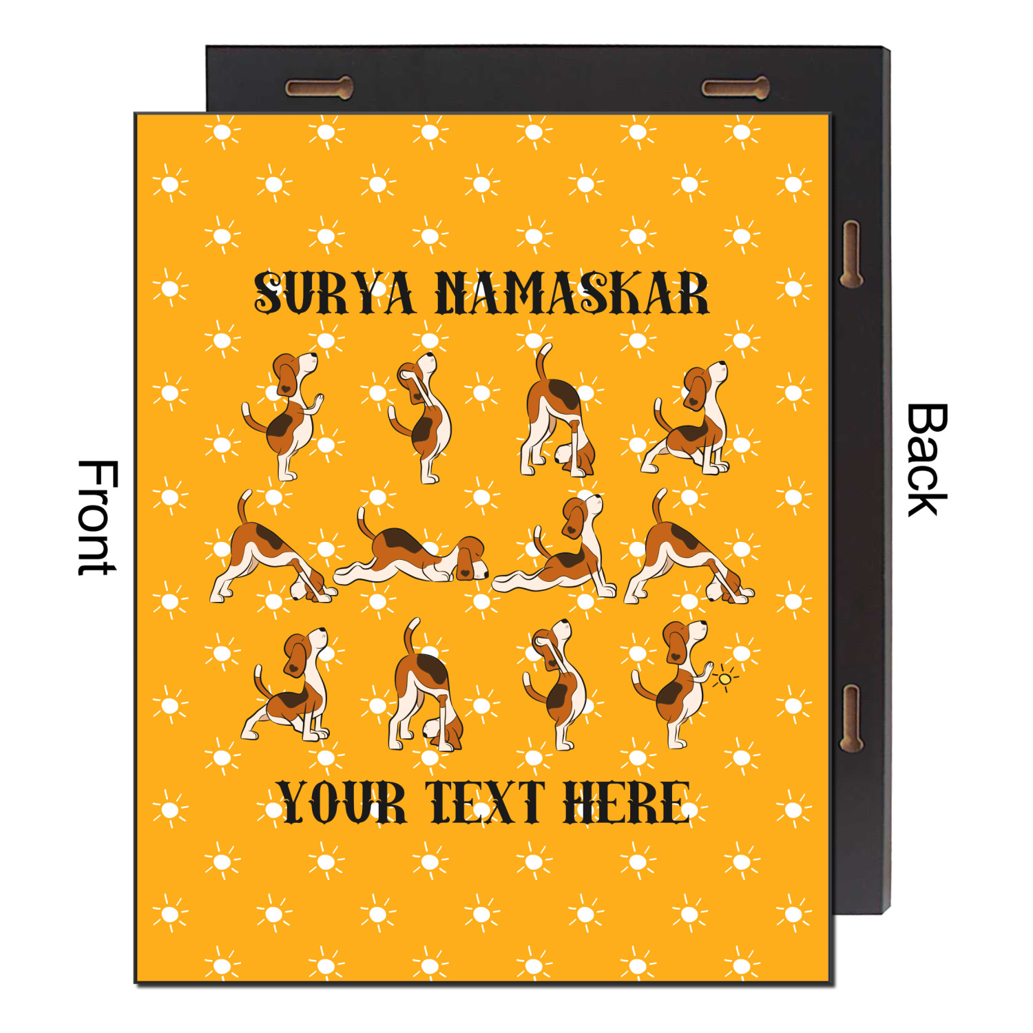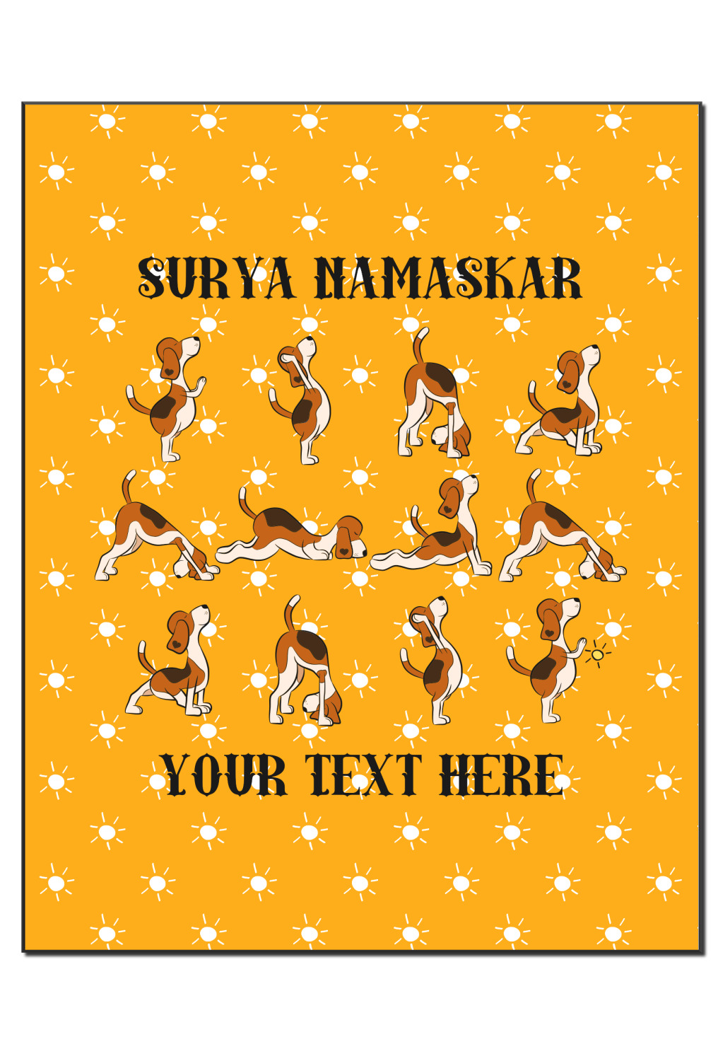 This design has a bright and happy background with little suns that are light yellow, while the rest is a slightly darker bright yellow. The main piece of the design is the set of adorable dogs doing yoga in several different positions. Your personalization goes above and below these graphics.