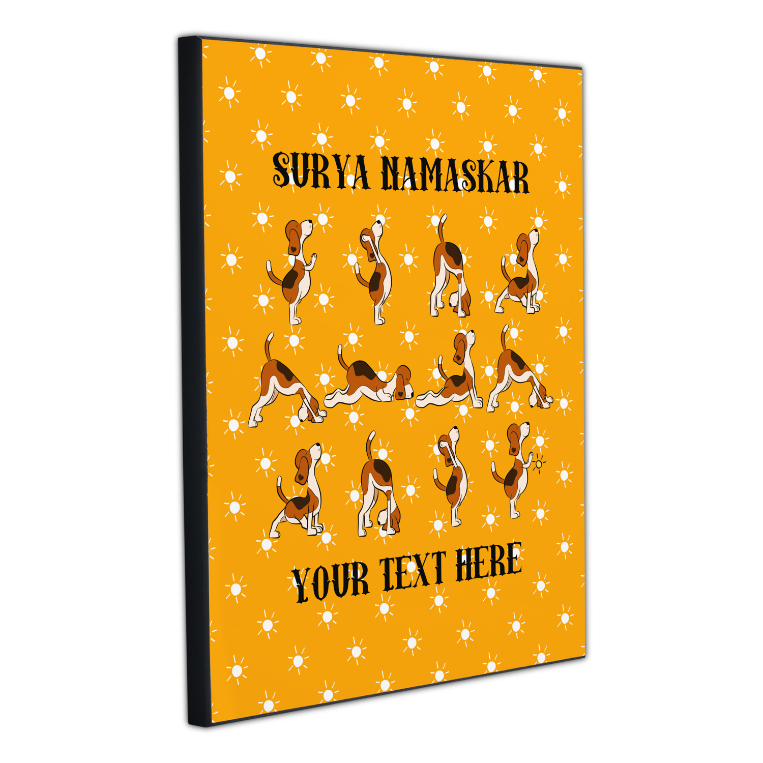 This design has a bright and happy background with little suns that are light yellow, while the rest is a slightly darker bright yellow. The main piece of the design is the set of adorable dogs doing yoga in several different positions. Your personalization goes above and below these graphics.