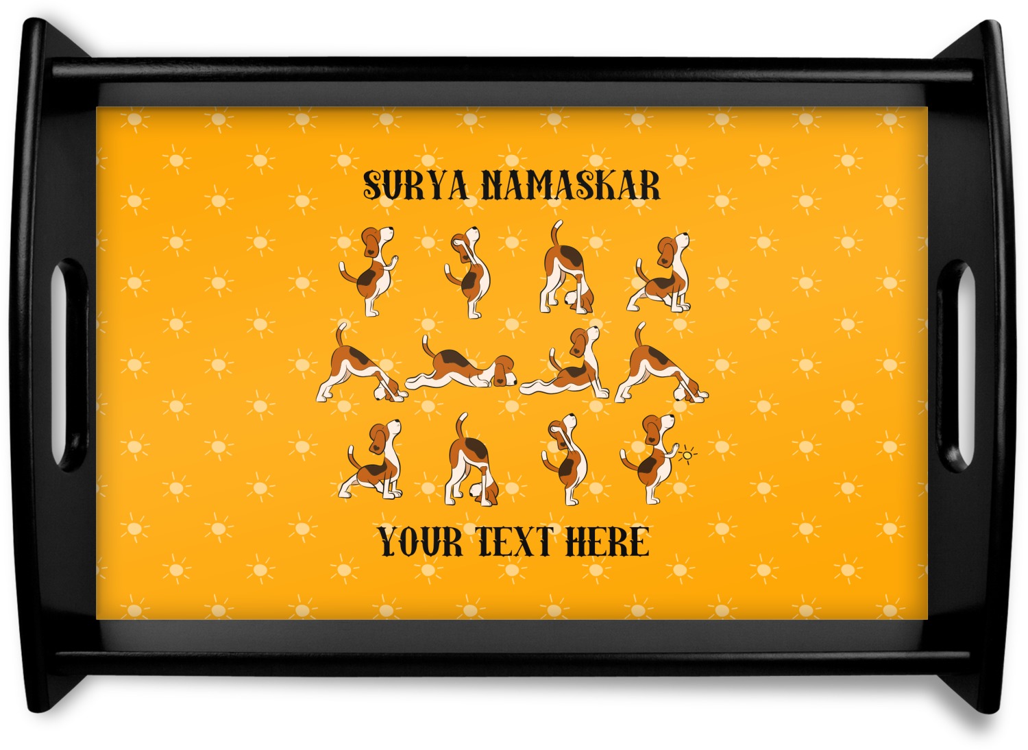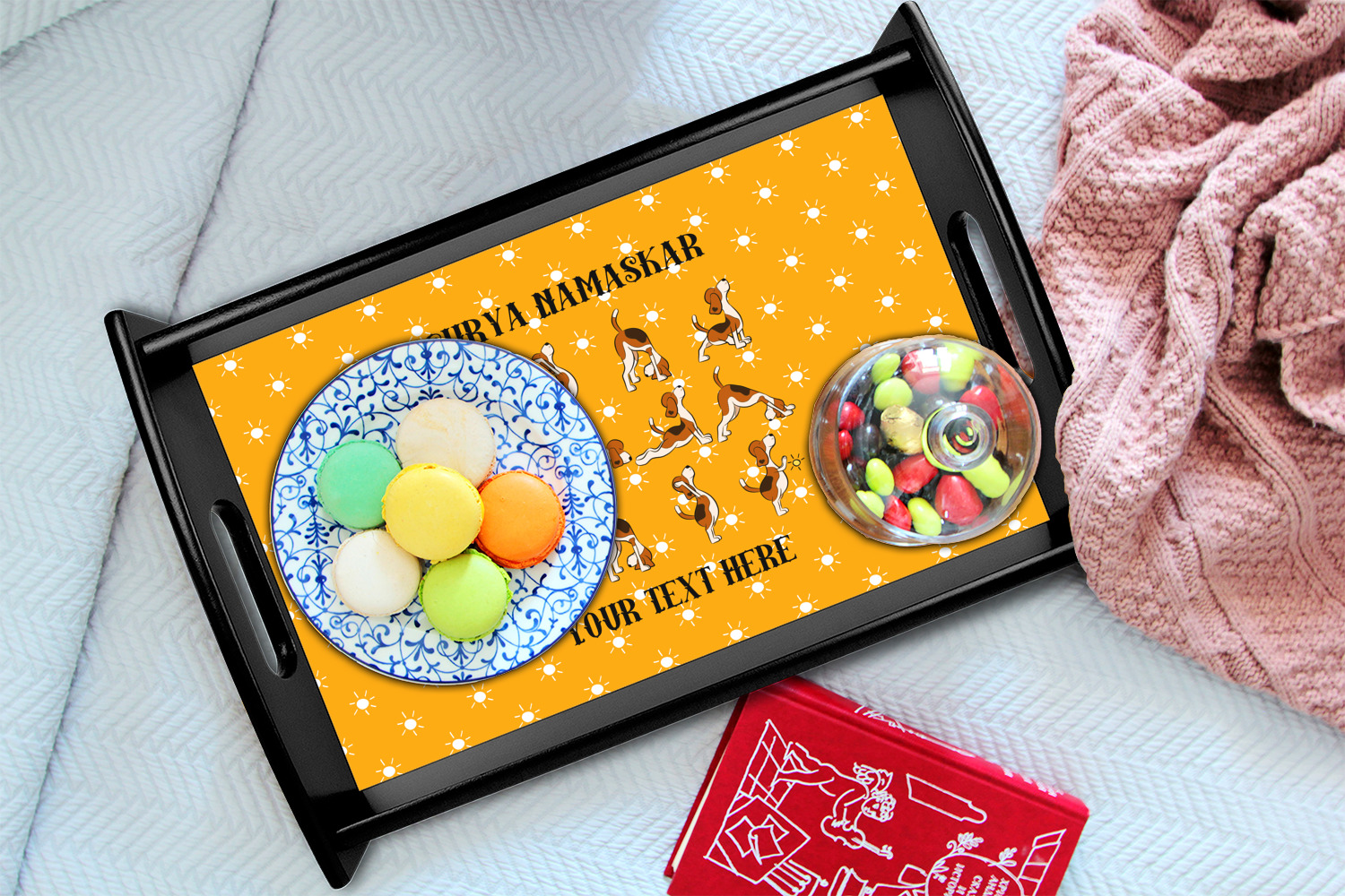 This design has a bright and happy background with little suns that are light yellow, while the rest is a slightly darker bright yellow. The main piece of the design is the set of adorable dogs doing yoga in several different positions. Your personalization goes above and below these graphics.