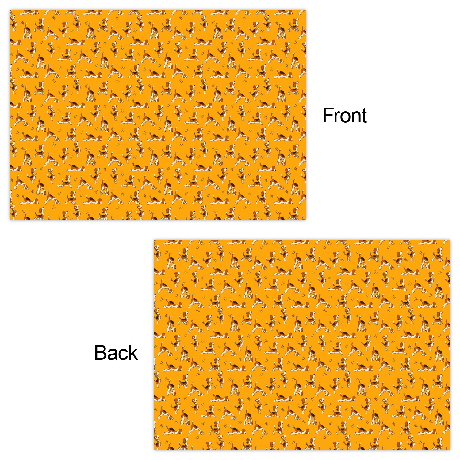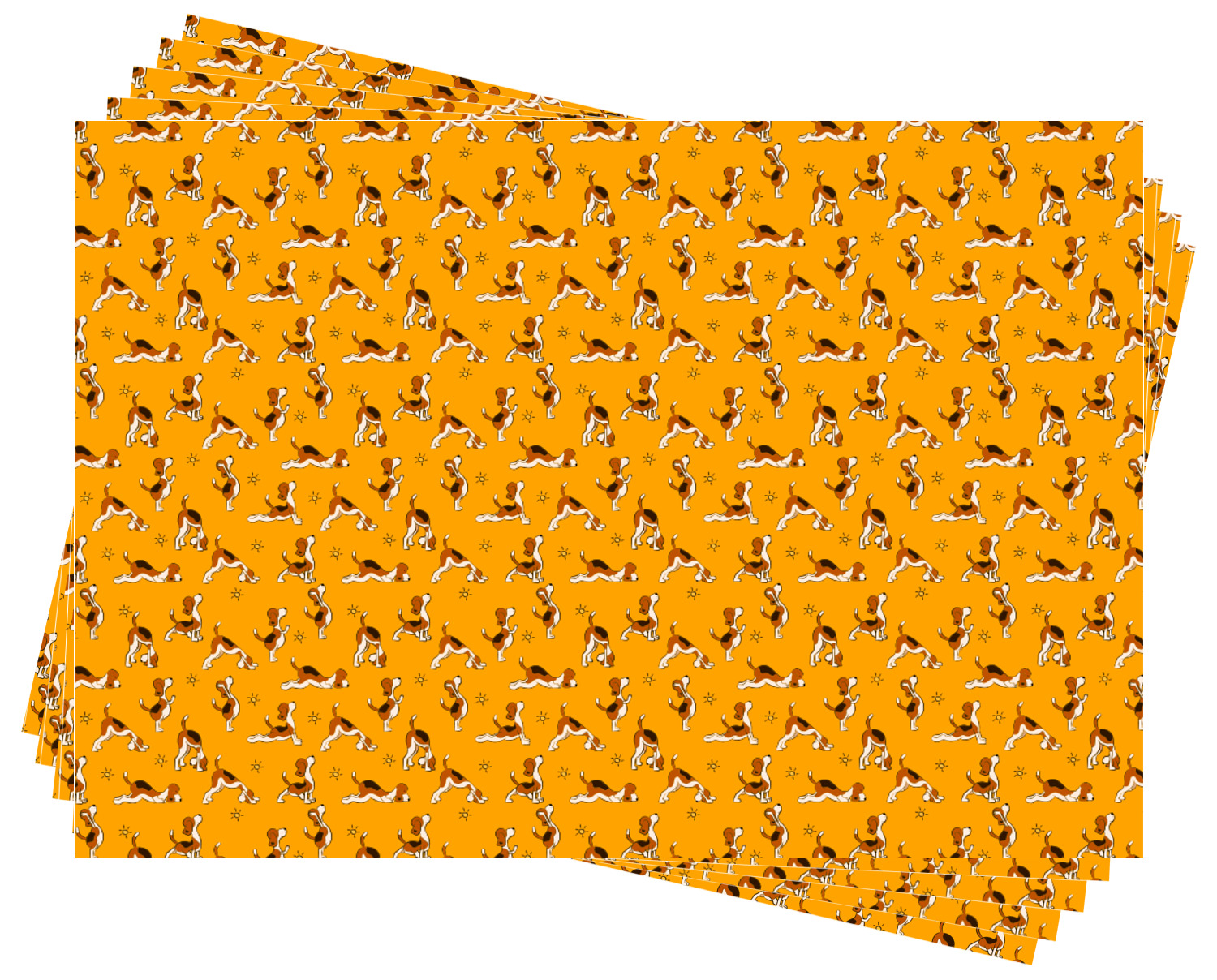 This design has a bright and happy background with little suns that are light yellow, while the rest is a slightly darker bright yellow. The main piece of the design is the set of adorable dogs doing yoga in several different positions. Your personalization goes above and below these graphics.