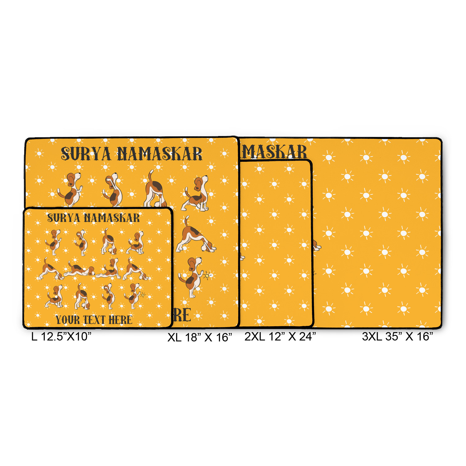 This design has a bright and happy background with little suns that are light yellow, while the rest is a slightly darker bright yellow. The main piece of the design is the set of adorable dogs doing yoga in several different positions. Your personalization goes above and below these graphics.