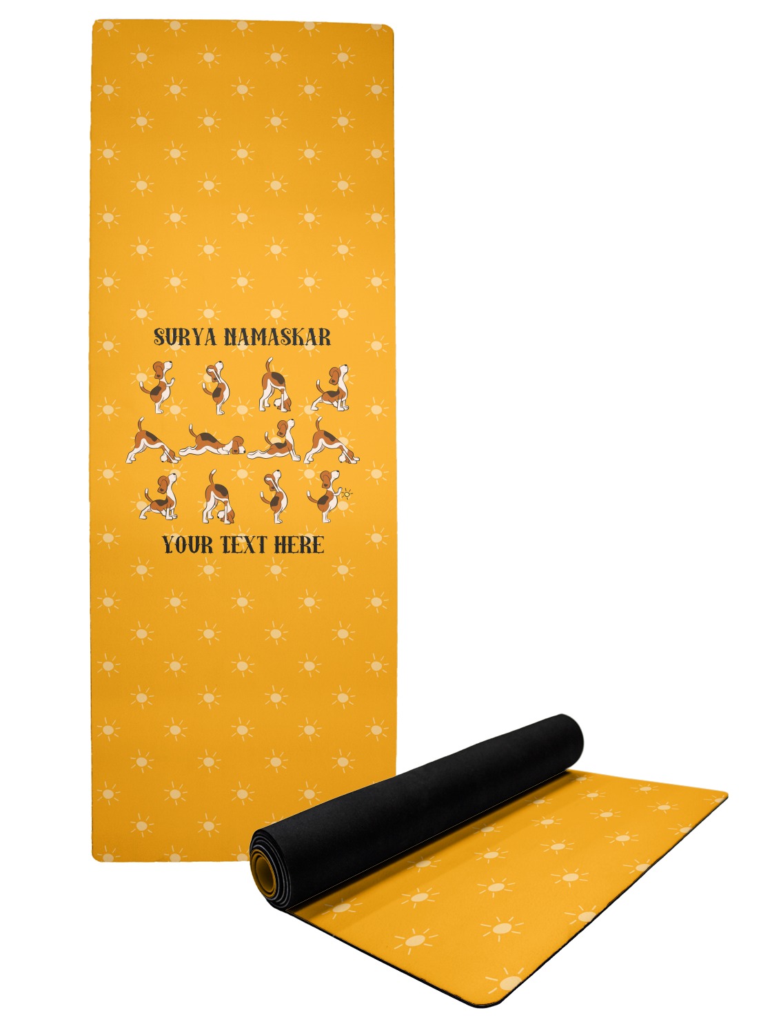 This design has a bright and happy background with little suns that are light yellow, while the rest is a slightly darker bright yellow. The main piece of the design is the set of adorable dogs doing yoga in several different positions. Your personalization goes above and below these graphics.