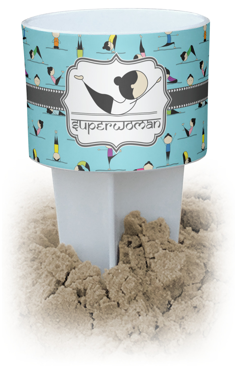 This cup holder has a large stake at its bottom that anchors it to the sand or ground below, while the cup holder rests above the stake. The entire drink holder is made of durable plastic and displays your customization around the cup holder portion. We sell these personalized beach spikers in two different colors: black and white.