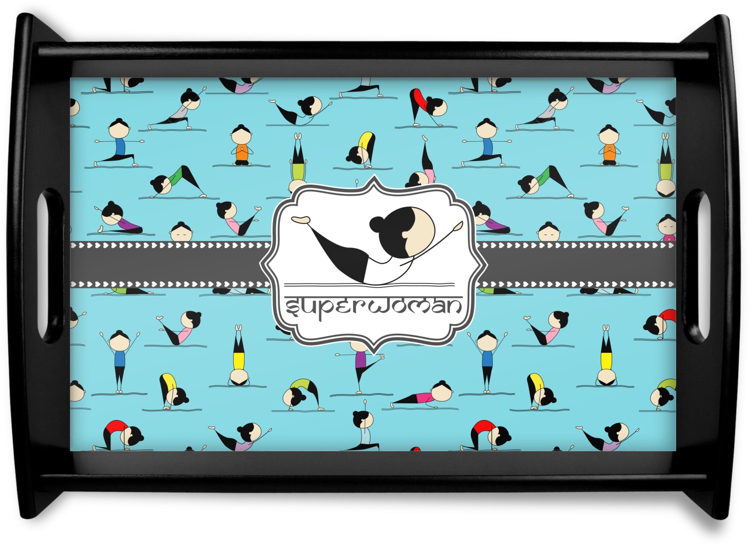 This serving tray with handles features square edges and two rounded sides, creating a very modern look. Each side is fabricated from a beautifully cut, natural wood. The bottom of the interior of the tray displays your customized design in bright, vibrant color. The tray is sold in both a black color and a natural wood look. Each variation of the wood serving tray has two sizes: Small, which is 14" x 10" x 2.25", and Large, which is 19.5" x 13.5" x 2.75".