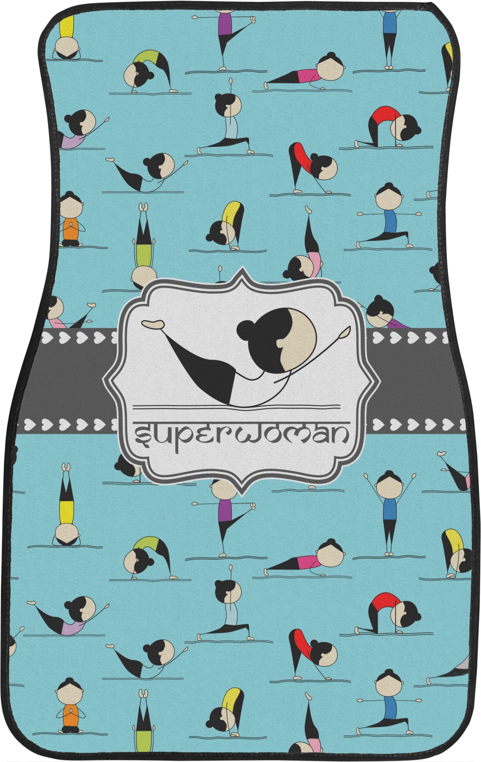 I have chosen to use a light teal background, with our hearts ribbon and our rectangular decorative frame. I chose the superwoman pose for my graphic along with the pose name for my personalization in a faux Sanskrit font.
