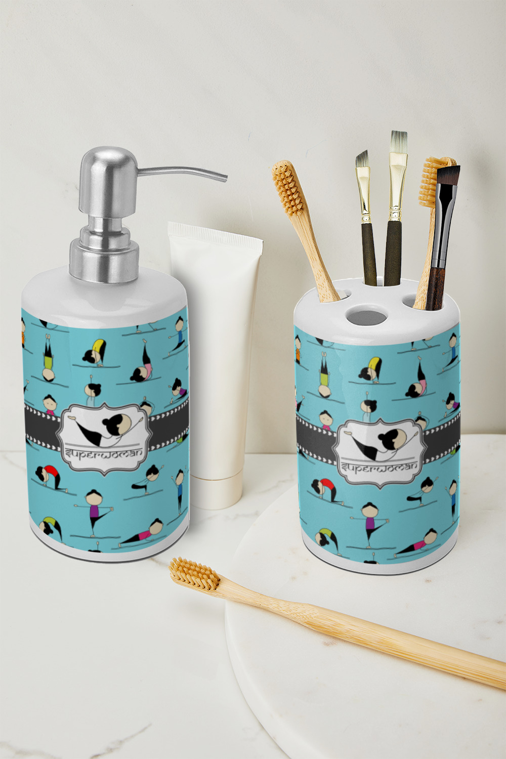This two piece, ceramic bathroom set will add the perfect splash of color to any bathroom. This set includes one pump dispenser, ideal for soap or lotion, and one toothbrush holder with four holes. Although originally designed for toothbrushes, the holder will also hold make-up brushes, nail files, and other bathroom tools.