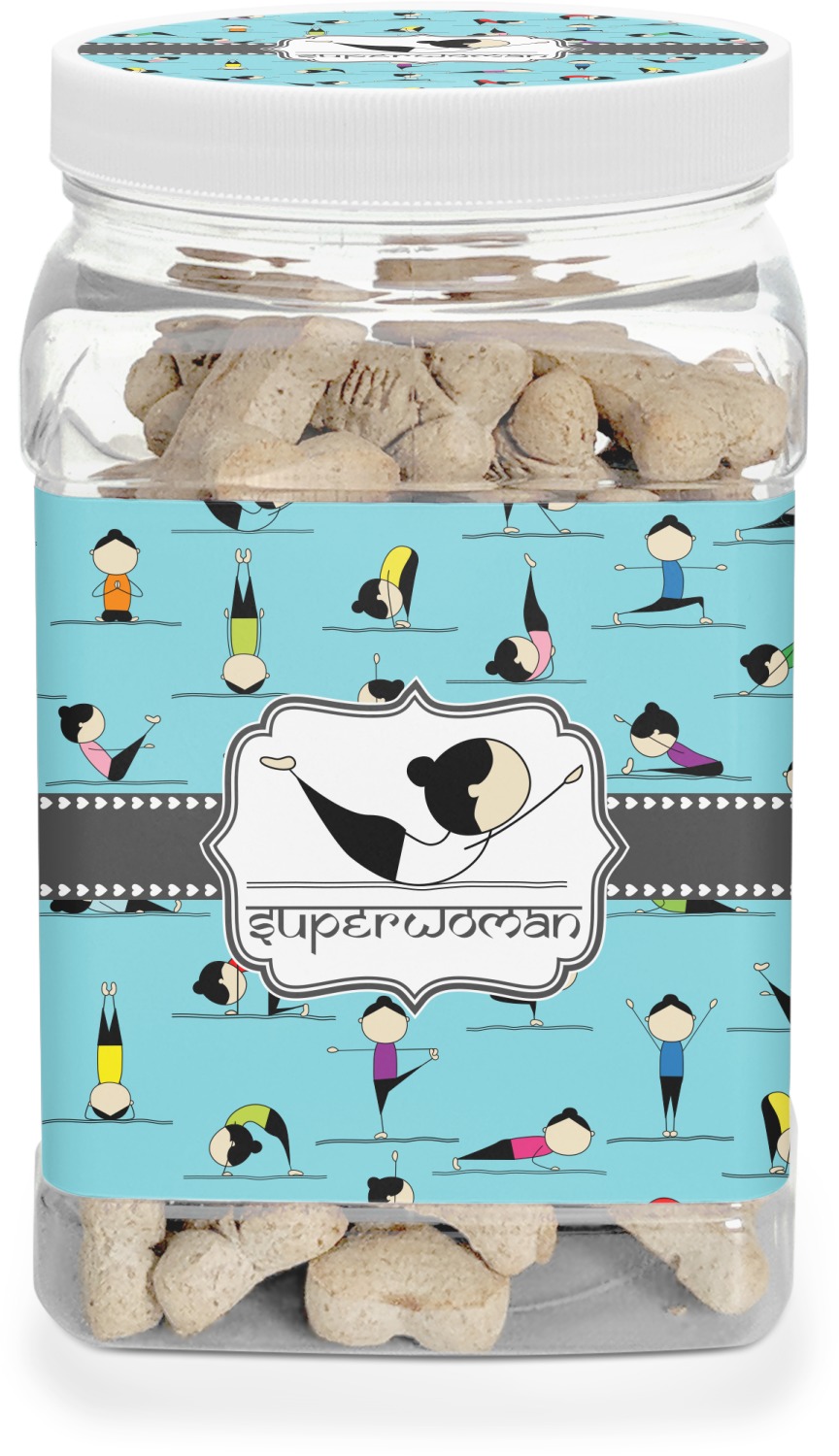 This half gallon jar, made from a sturdy plastic, is the perfect way to keep treats from any naughty pet paws, while still keeping them ready on hand for when your pup performs an impressive trick. This dog cookie jar features a screw-on, white lid that displays your personalized design on a vinyl sticker. We apply another customized sticker that wraps around the front and sides of the jar. Our dog treat jar also has indentations on the rear ends of the sides, which allows for convenient handling, and its square frame allows for easy storage.