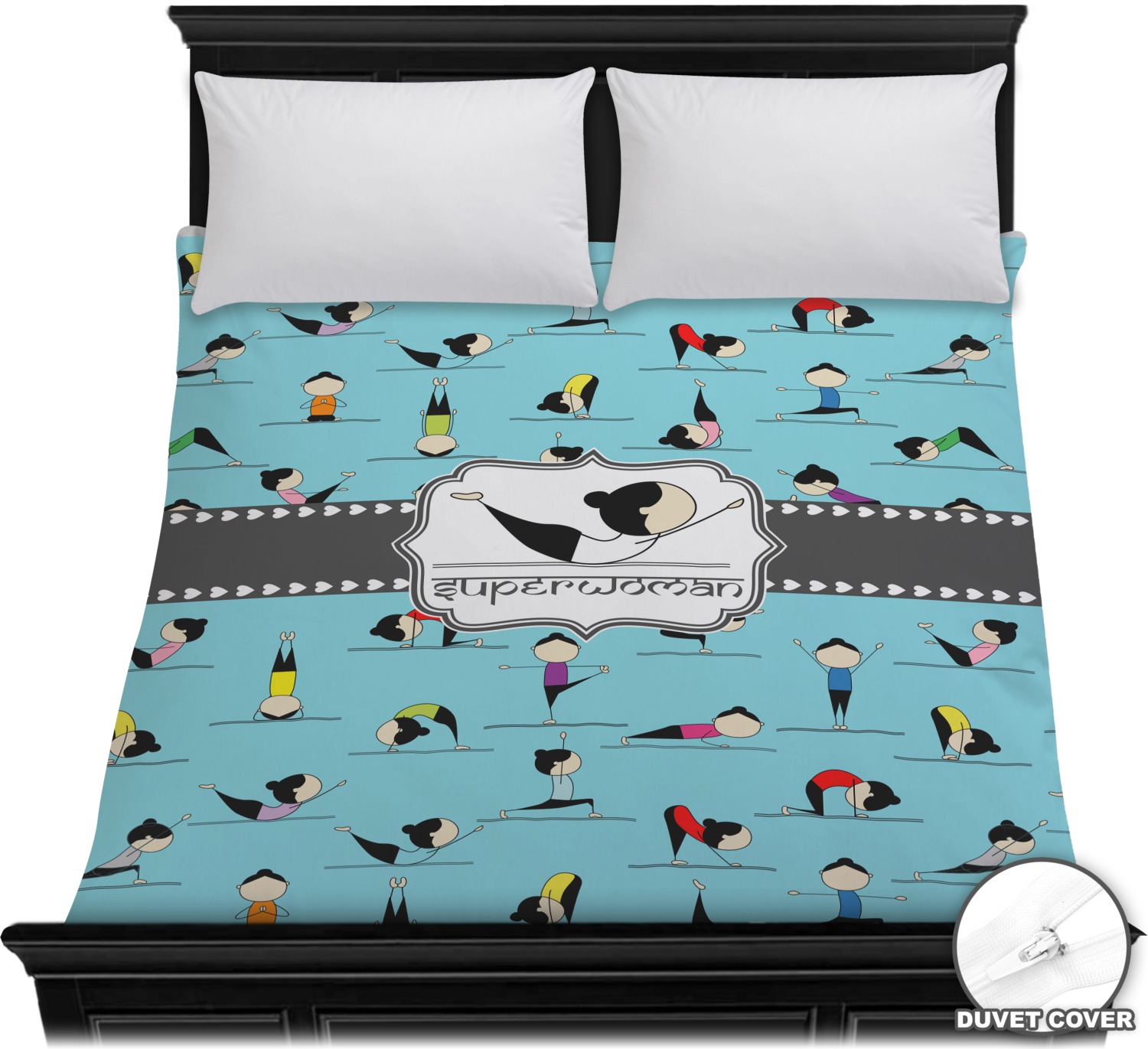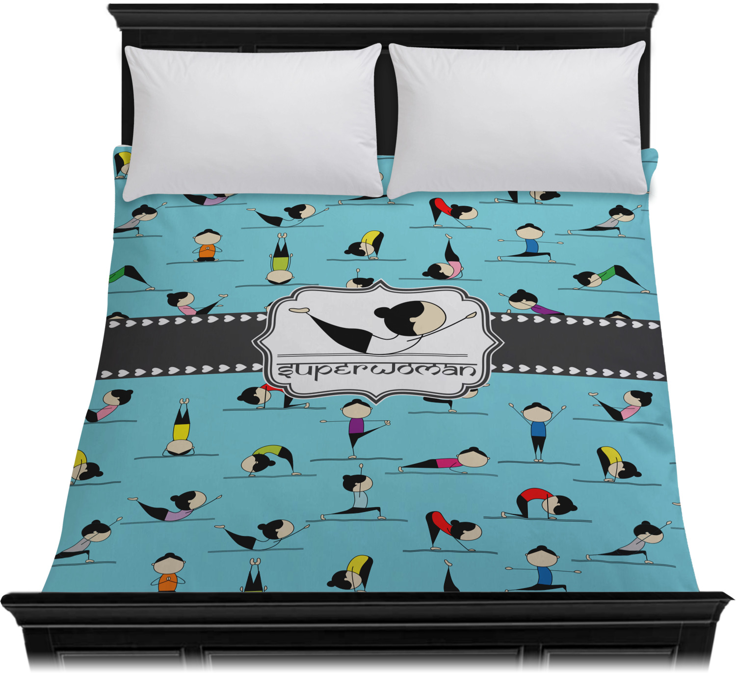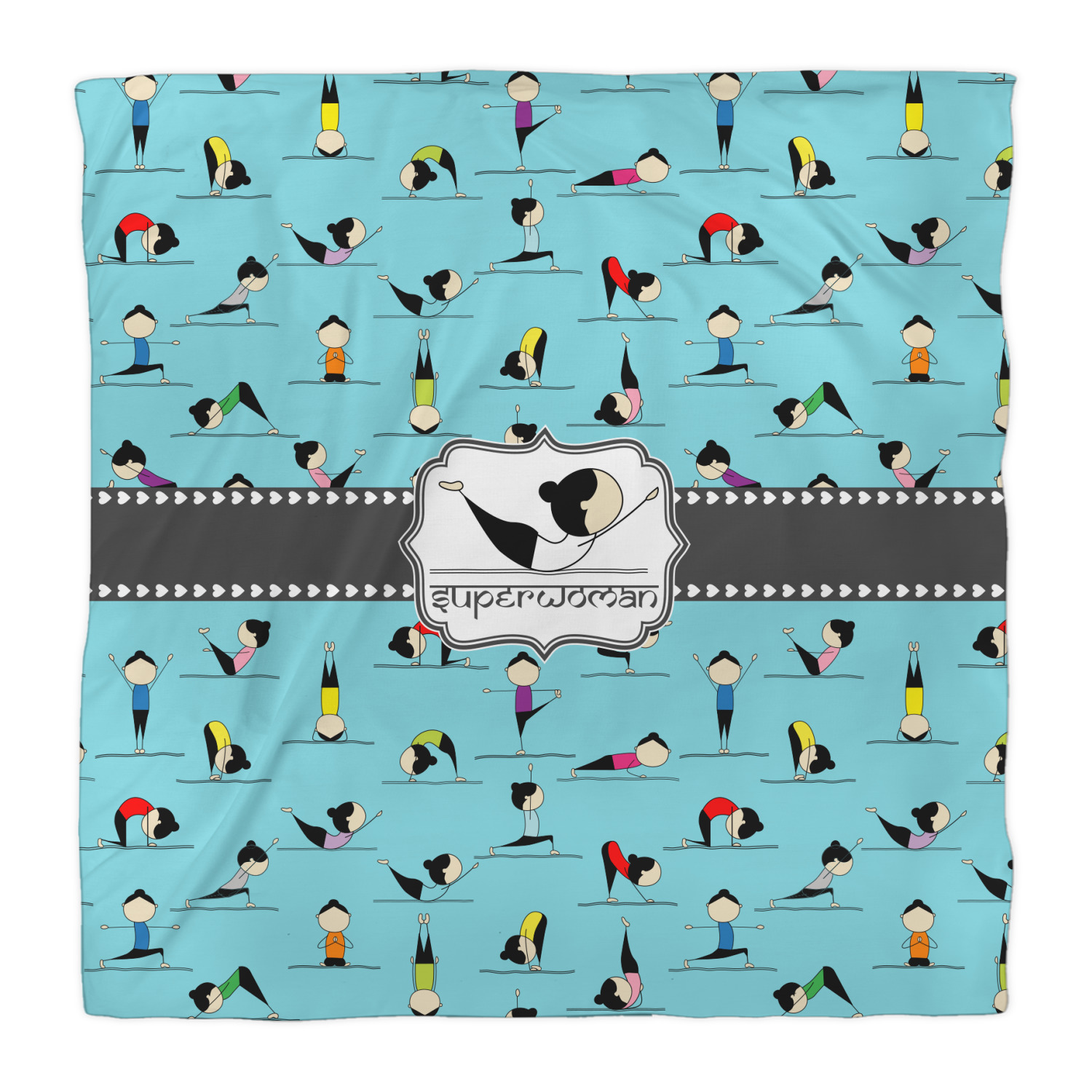 I have chosen to use a light teal background, with our hearts ribbon and our rectangular decorative frame. I chose the superwoman pose for my graphic along with the pose name for my personalization in a faux Sanskrit font.