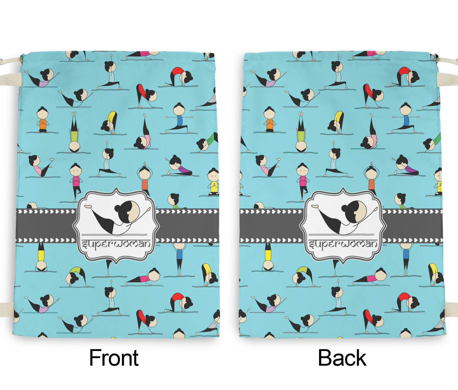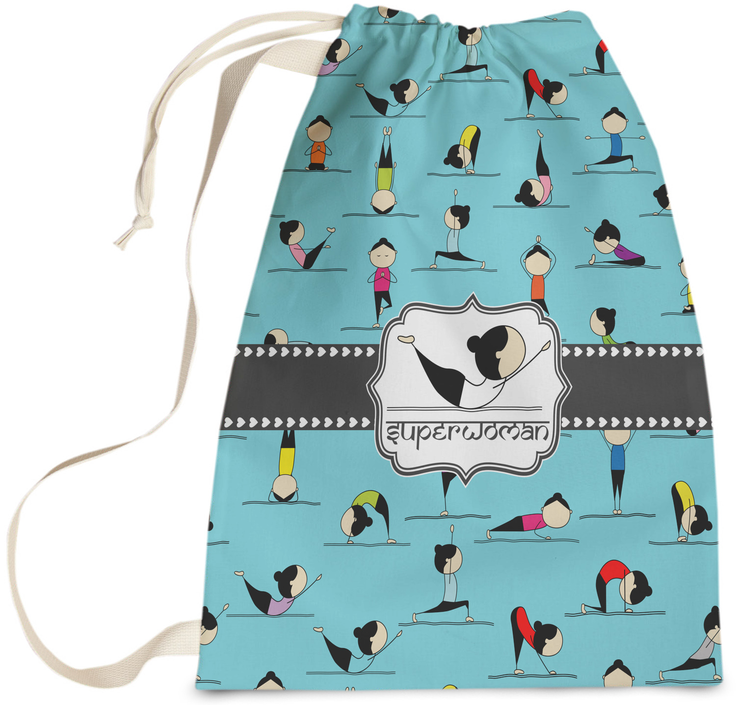 Carry your laundry in style with these customized laundry bags. Available in two sizes, featuring a natural colored woven strap and a cinch cord, these bags hold a lot of clothes or anything else you want to fit in them.