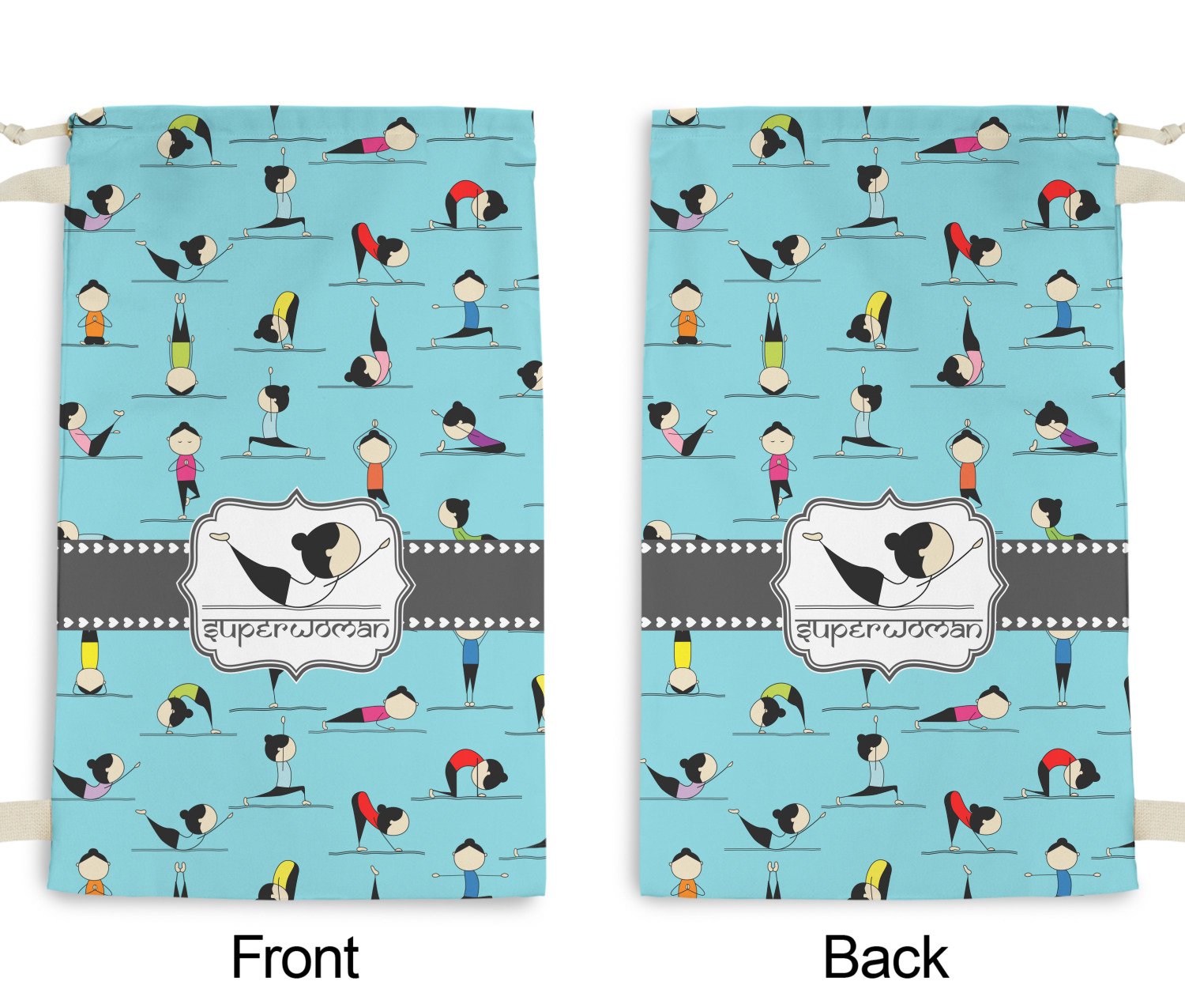 I have chosen to use a light teal background, with our hearts ribbon and our rectangular decorative frame. I chose the superwoman pose for my graphic along with the pose name for my personalization in a faux Sanskrit font.