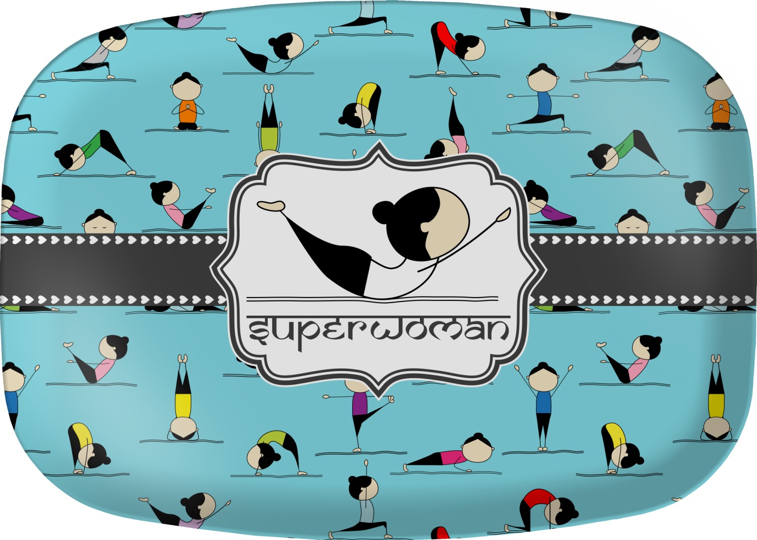 I have chosen to use a light teal background, with our hearts ribbon and our rectangular decorative frame. I chose the superwoman pose for my graphic along with the pose name for my personalization in a faux Sanskrit font.