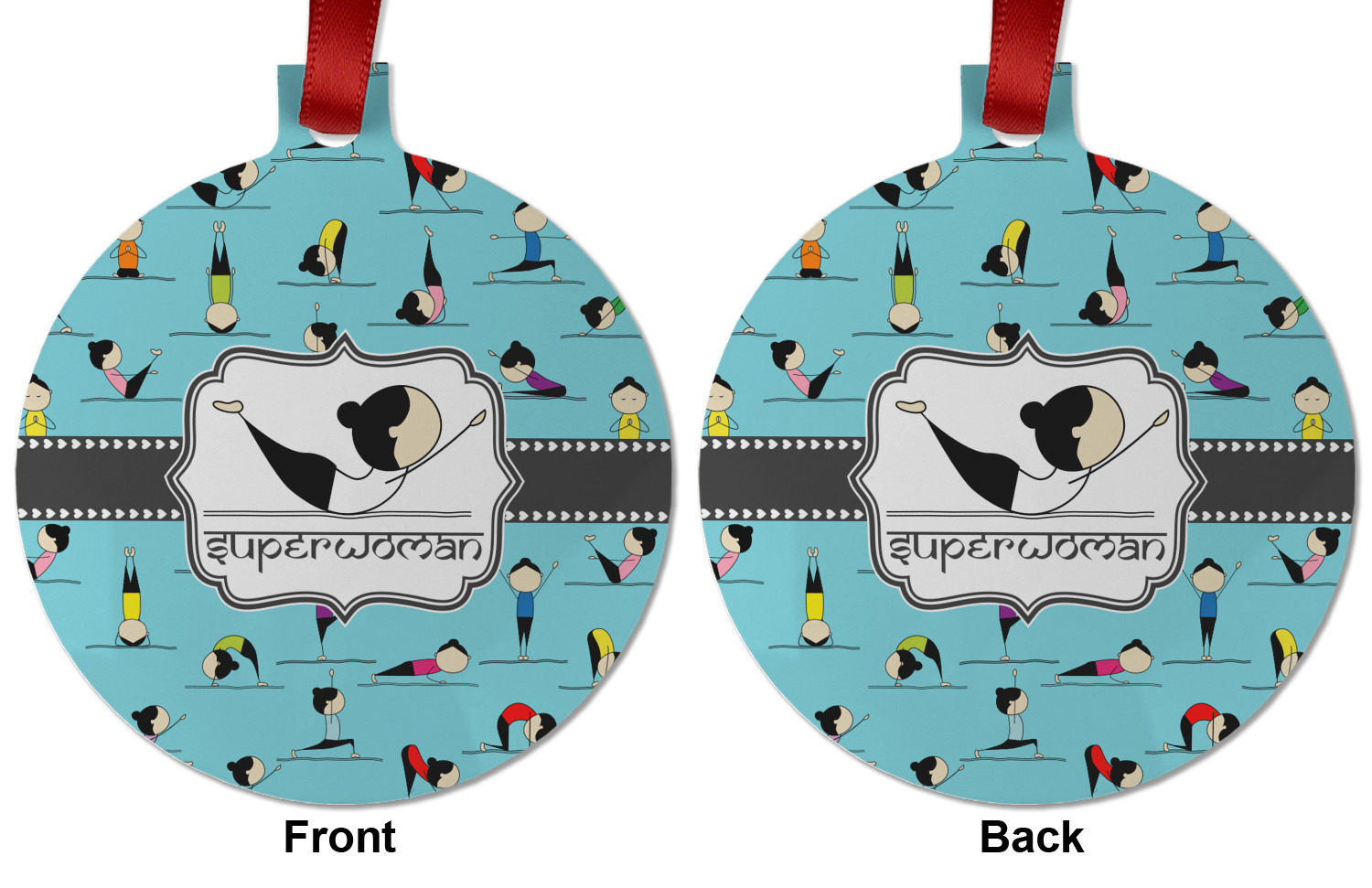 I have chosen to use a light teal background, with our hearts ribbon and our rectangular decorative frame. I chose the superwoman pose for my graphic along with the pose name for my personalization in a faux Sanskrit font.