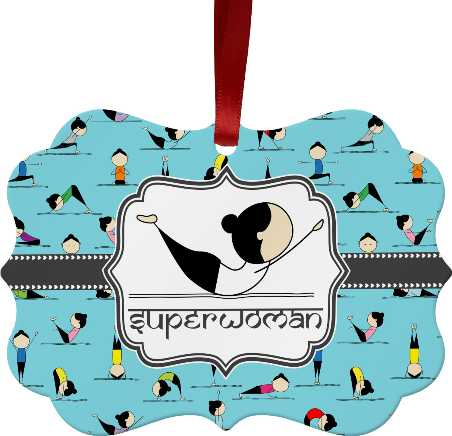 I have chosen to use a light teal background, with our hearts ribbon and our rectangular decorative frame. I chose the superwoman pose for my graphic along with the pose name for my personalization in a faux Sanskrit font.