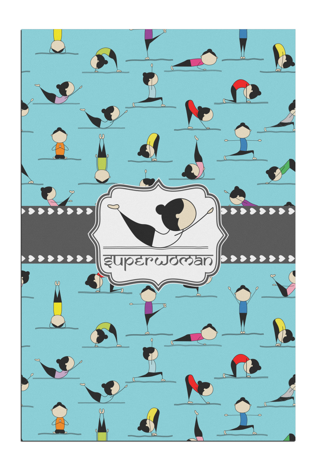 I have chosen to use a light teal background, with our hearts ribbon and our rectangular decorative frame. I chose the superwoman pose for my graphic along with the pose name for my personalization in a faux Sanskrit font.